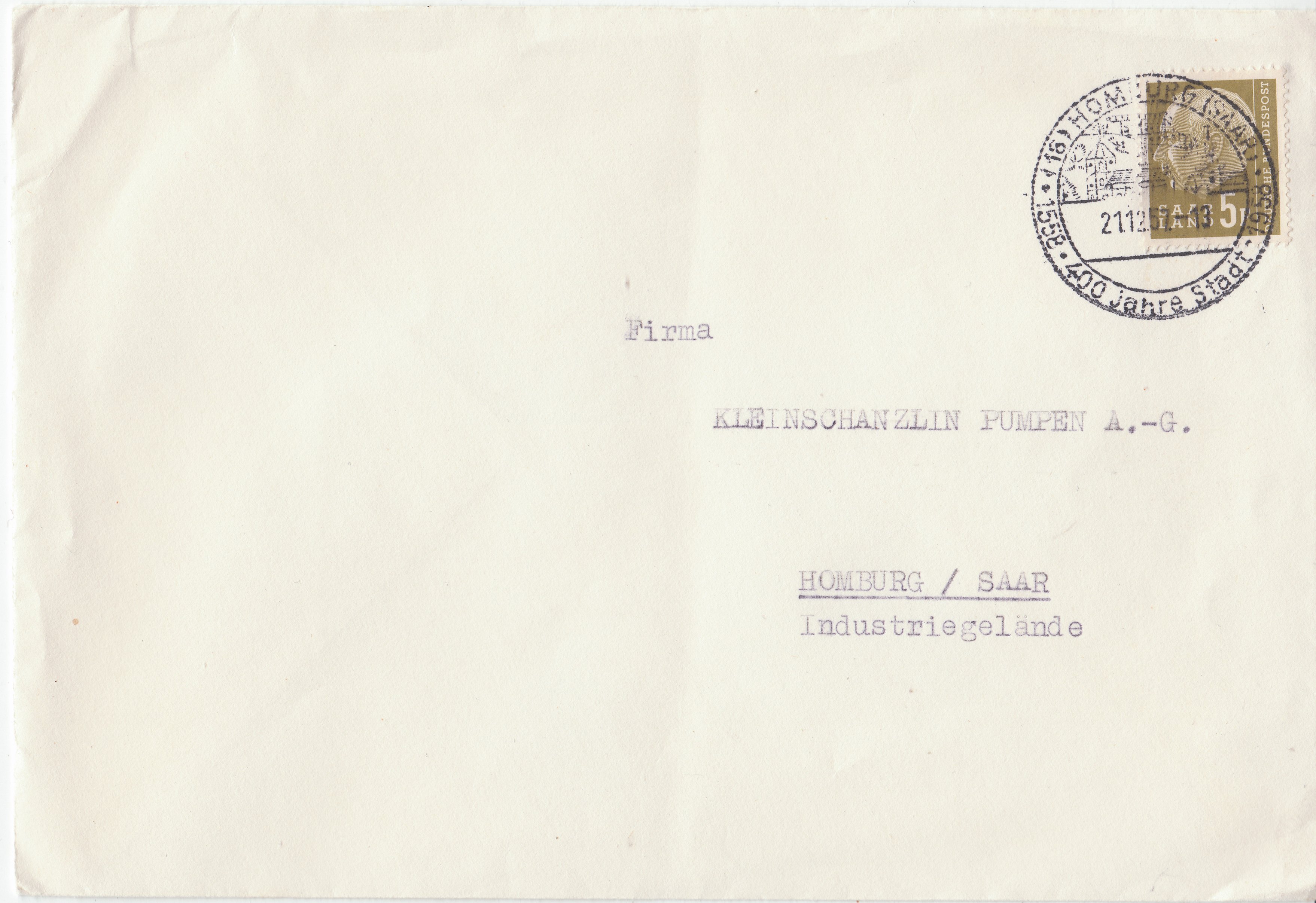 EF der Saar MiNr. 411 am 21.12.1957 portorichtig auf Standarddrucksache (5 Fr).