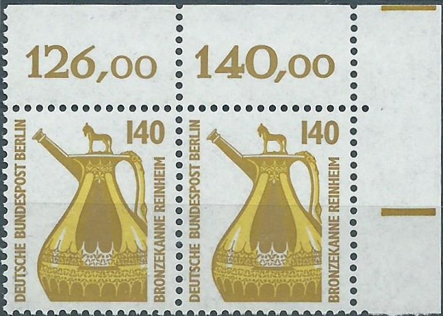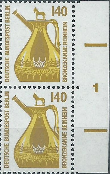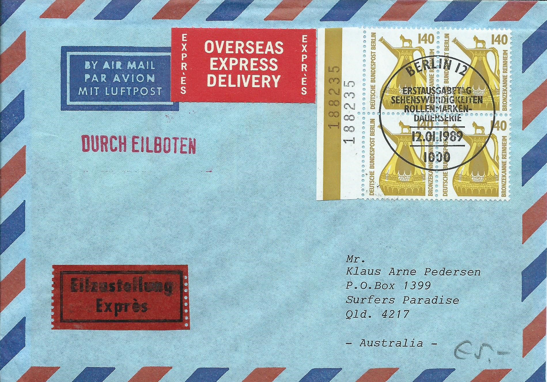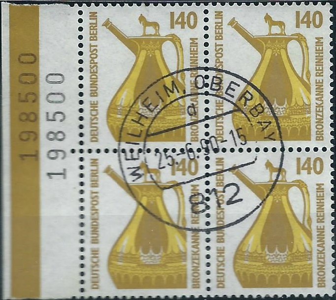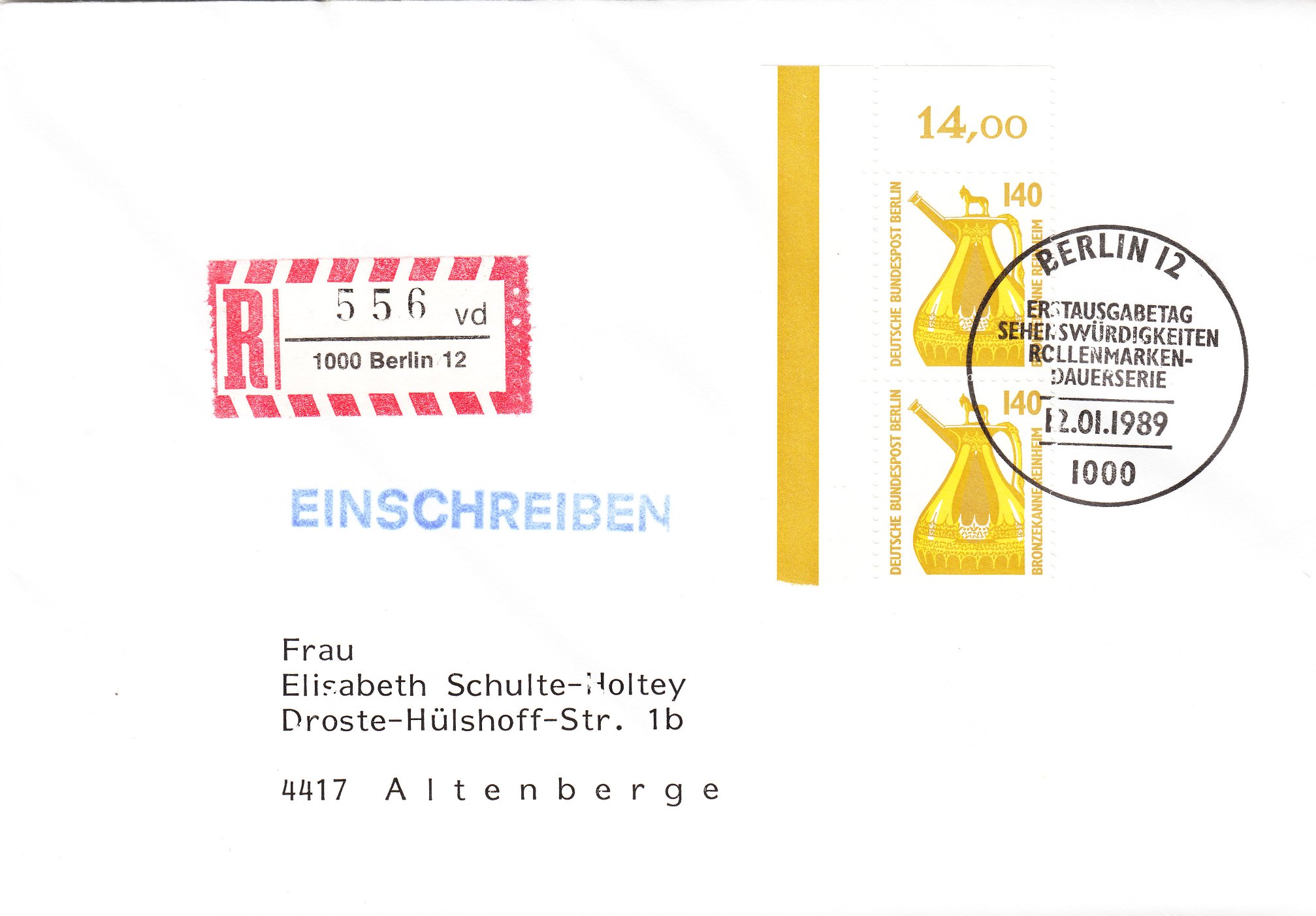 der hier vorliegende Beleg kann gleich in 2 „Ländersammlungen“ einsortiert werden. Er trägt je eine motivgleiche Marke von Bund und Berlin, die Bronzekanne Reinheim aus der Serie Sehenswürdigkeiten zu 140 Pf. Die Bund-Marke ist als linkes oberes Bogeneckrandstück, die Berlin-Marke als rechtes oberes Bogeneckrandstück verklebt worden. Dazu ein schöner zum Motiv passender Sonderstempel von Gersheim vom 12.1.89. Und das ist tatsächlich ein Ersttagsbrief, so wie das unten links unter dem Schmuckzudruck steht, die Marken wurden an dem Tag verausgabt. Der Brief lief als Einschreiben portorichtig zu 2,80 DM.