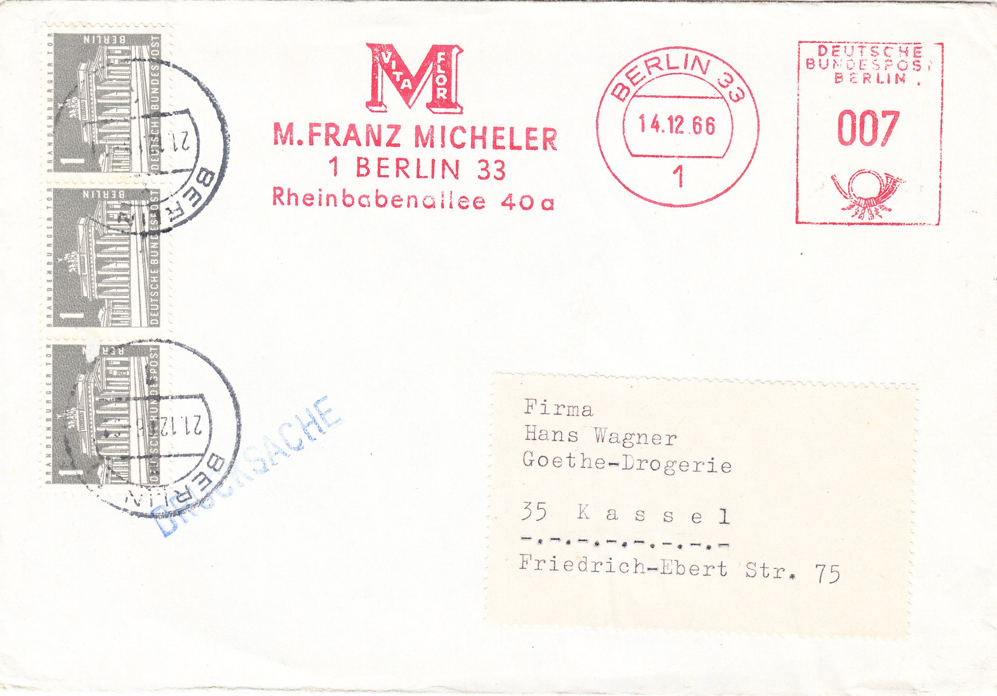 Die am 23.02.1957 erschienene Berlin MiNr. 140 wurde ab dem 20.07.1960 auch an den Postschaltern der Bundesrepublik Deutschland verkauft. Die Idee dabei war, daß diese Wertstufe zu 1 Pfennig aus Solidarität zu Berlin zusätzlich zur eigentlichen Frankatur der Sendung verklebt werden sollte.