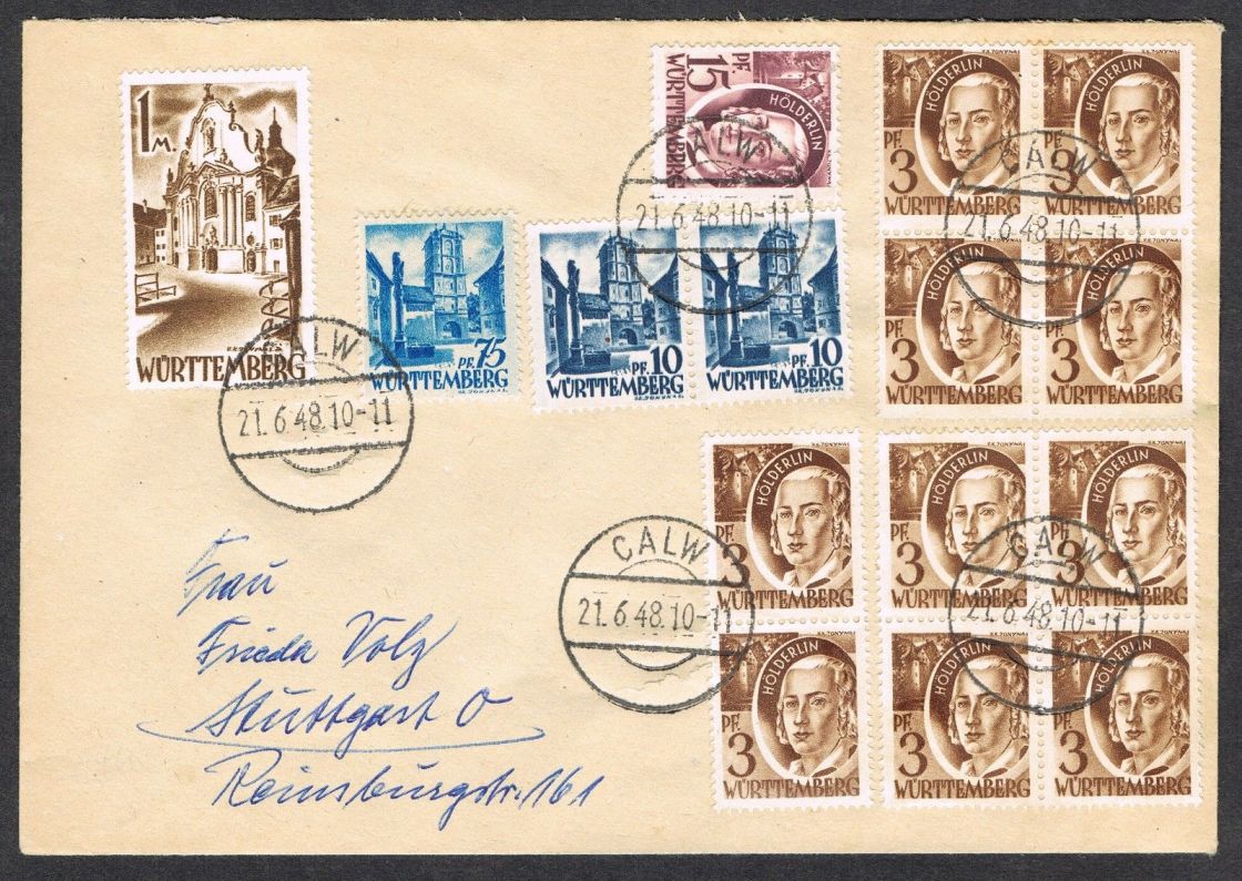 Anbei ein Beleg einer Auktion aus eBay die schon abgelaufen ist. Es ist eine Zehnfachfrankatur aus der Französischen Zone Württemberg. Beginnen wir erst mit der dahinterliegenden Geschichte der Zehnfachfrankatur. Am 21.08.1948 war die Währungsreform in Westdeutschland. Hier wurde jetzt die Reichsmark von der Mark abgelöst. Folglich haben auch die Briefmarken mit Reichsmark und Reichspfennig ihre Gültigkeit verloren. Dahingehend waren die alten Marken also auf einen "Schlag" entwertet. Um diese aber dennoch verwenden zu können gab es die Möglichkeit diese noch am 21.08.1948 aufzubrauchen. Hierbei galt der Umrechnungsfaktor von 10, daher auch die Bezeichnung "Zehnfachfrankatur". Dies bedeutet als, es musste also die 10fache Menge an Briefmarken auf dem Brief aufgebracht sein. In diesem Beispiel war die Porto Stufe 24 Pfennig, so mussten unter Verwendung der alten Reichsmark Briefmarken 240 Reichspfennig aufgebracht werden.Geduldet wurden diese Frankaturen bis zum ~23.08.1948.