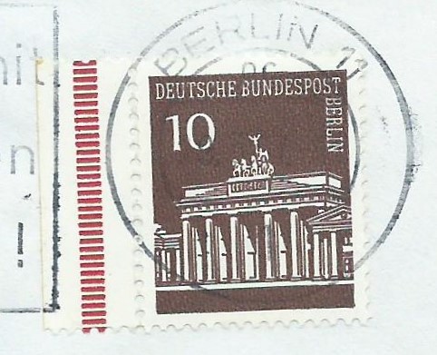 Mich hat der Beleg sofort angelächelt, als ich ihn gesehen habe. Eine Berlin Brandenburger Tor 10 Pf mit linkem Randstück, noch dazu eine rote Strichelleiste auf dem Randstück!