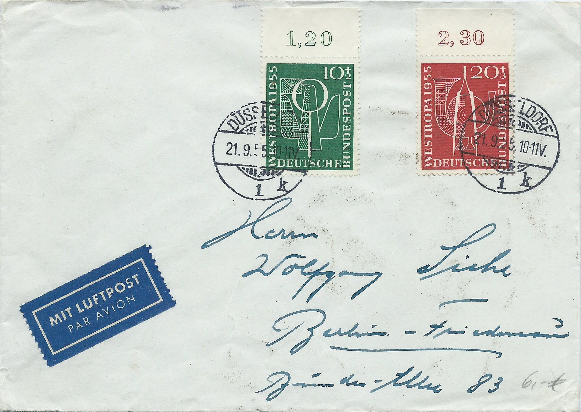 von der Ausgabe Internationale Briefmarkenausstellung WESTROPA Düsseldorf 1955 ist mir ein Brief aufgefallen, den ich sofort erworben habe. Als Frankatur dienen je eine Marke zu 10 + 2 und 20 + 3 Pf. Beide Marken haben noch den Oberrand mit Reihenwertzähler aufzuweisen. Das alles war aber gar nicht der Grund, weshalb ich den Beleg gekauft habe. Mich hat sofort der Stempel begeistert! Wie vielleicht einige von Euch wissen, sammle ich auch diese Art der Stempel, die sogenannten Kreisgitterstempel. Und diese Stempel von Düsseldorf vom 21.9.55 sind einfach nur traumhaft schön, da konnte ich nicht anders, als sie zu erwerben. Seht selbst: