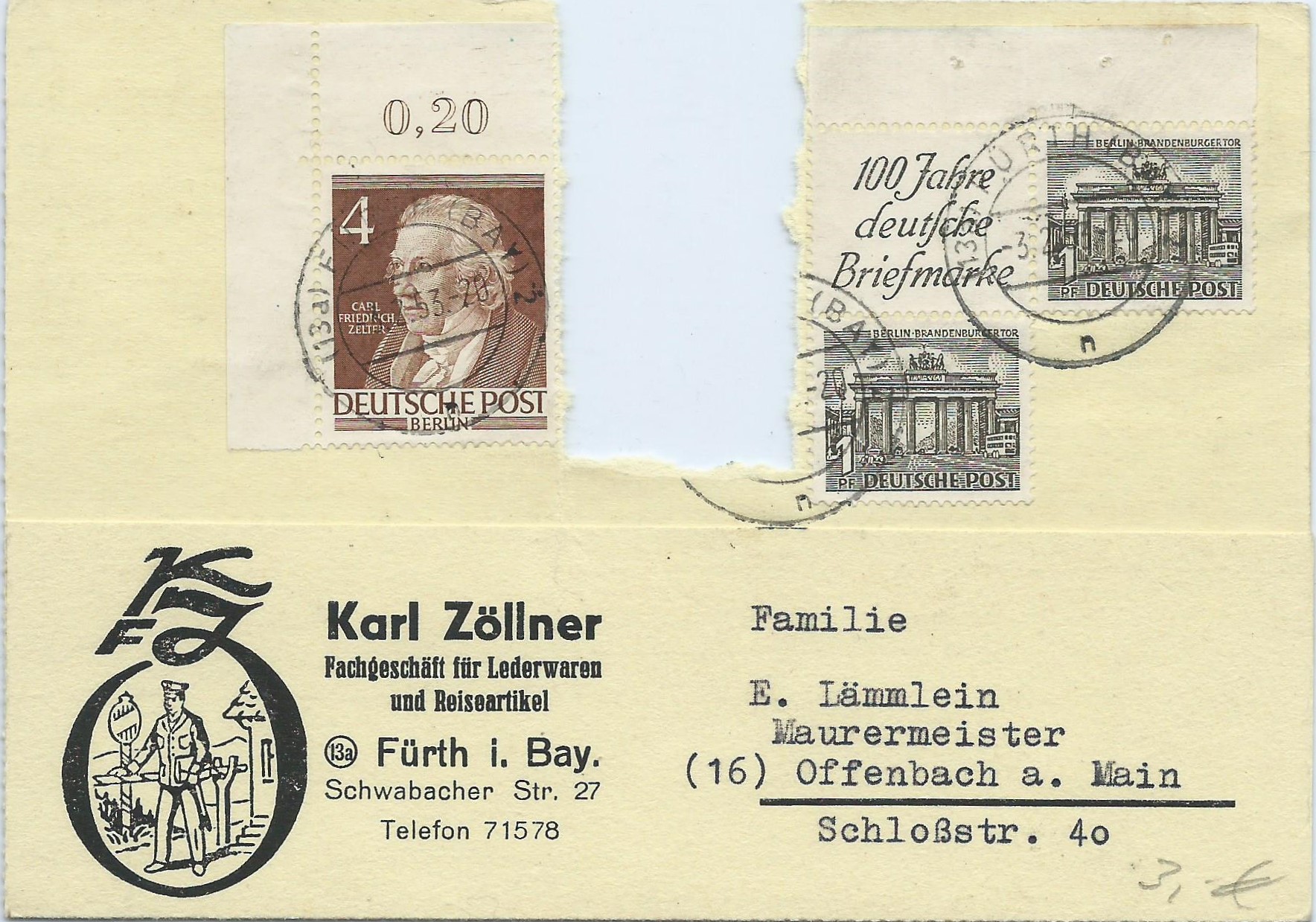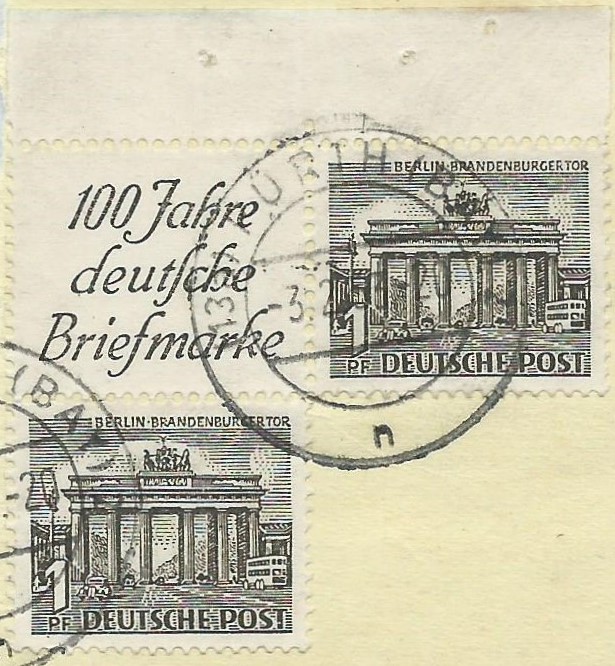 Tja, ich habe es getan, für 2 Euro. Und warum? Ganz einfach: Rechts ist ein Zusammendruck aus einem Heftchenblatt von Berlin zu sehen. Man kann sich nun aussuchen, welcher. Entweder nimmt man den waagerechten mit dem Werbefeld, dann ist es Mi.Nr. W 1, nimmt man den senkrechten, hat man Mi.Nr. S 1. Und nicht zu verachten ist der noch vorhandene Heftchenblatt-Rand! Der ist meistens abgerissen worden. Alleine das rechtfertigt schon mal den Kauf dieser zerfledderten Karte, da solche schönen Zusammendrucke immer gerne genommen werden. Und was man damit machen kann, sieht man hier: