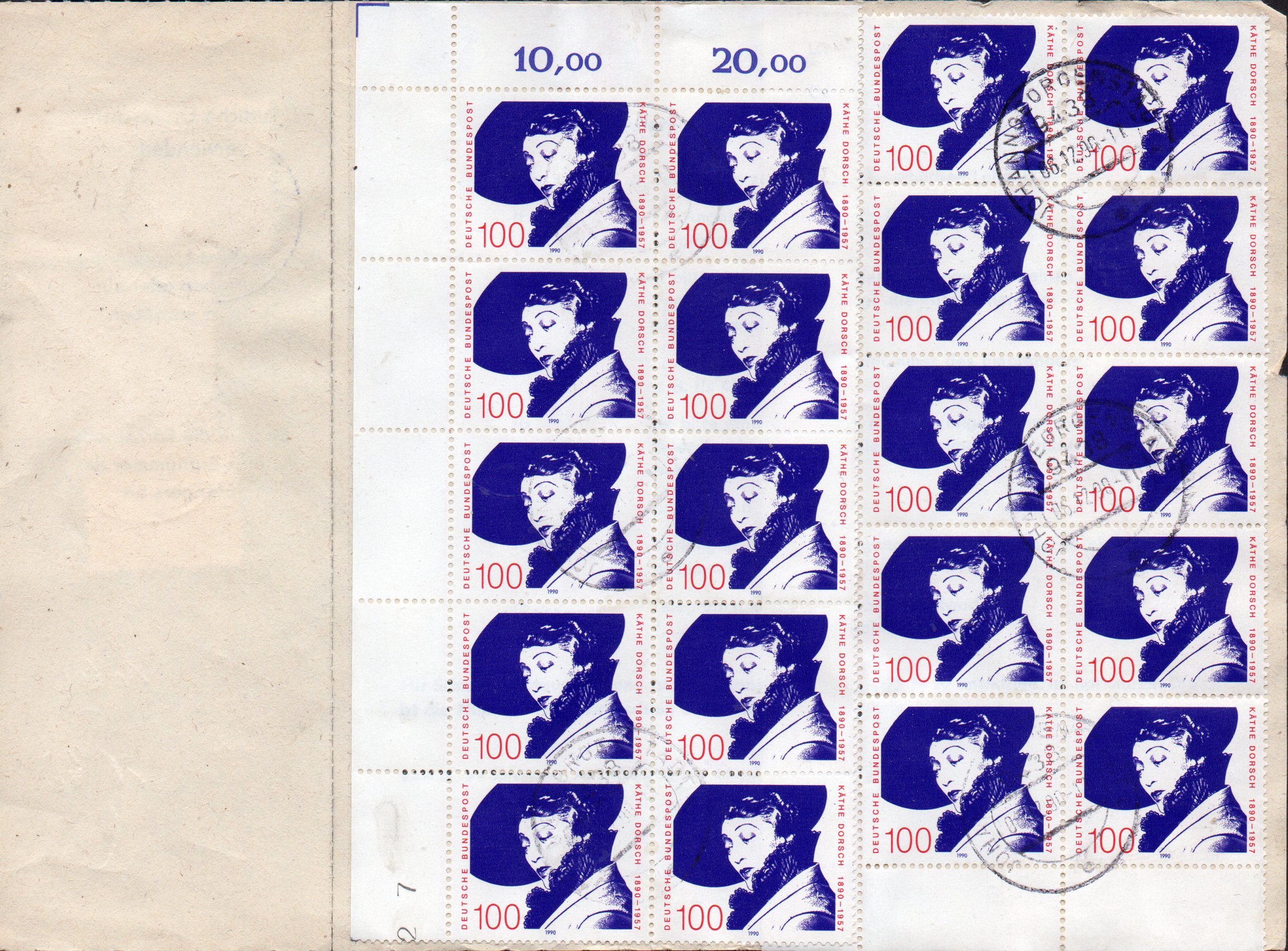 Markenheftchenblatt MiNr 21 und eine 20Pf-Marke aus der DS "Frauen" der Deutschen Bundespost auf einem Einschreibebrief von 21 bis 50 Gramm (Porto Brief 170Pf, Einschreiben 250Pf zusammen 420Pf) von Sindelfingen nach Kassel. Der Brief wurde mit dem Sonderstempel Tag der Briefmarke 1990 bei der Messe in Sindelfingen abgestempelt.