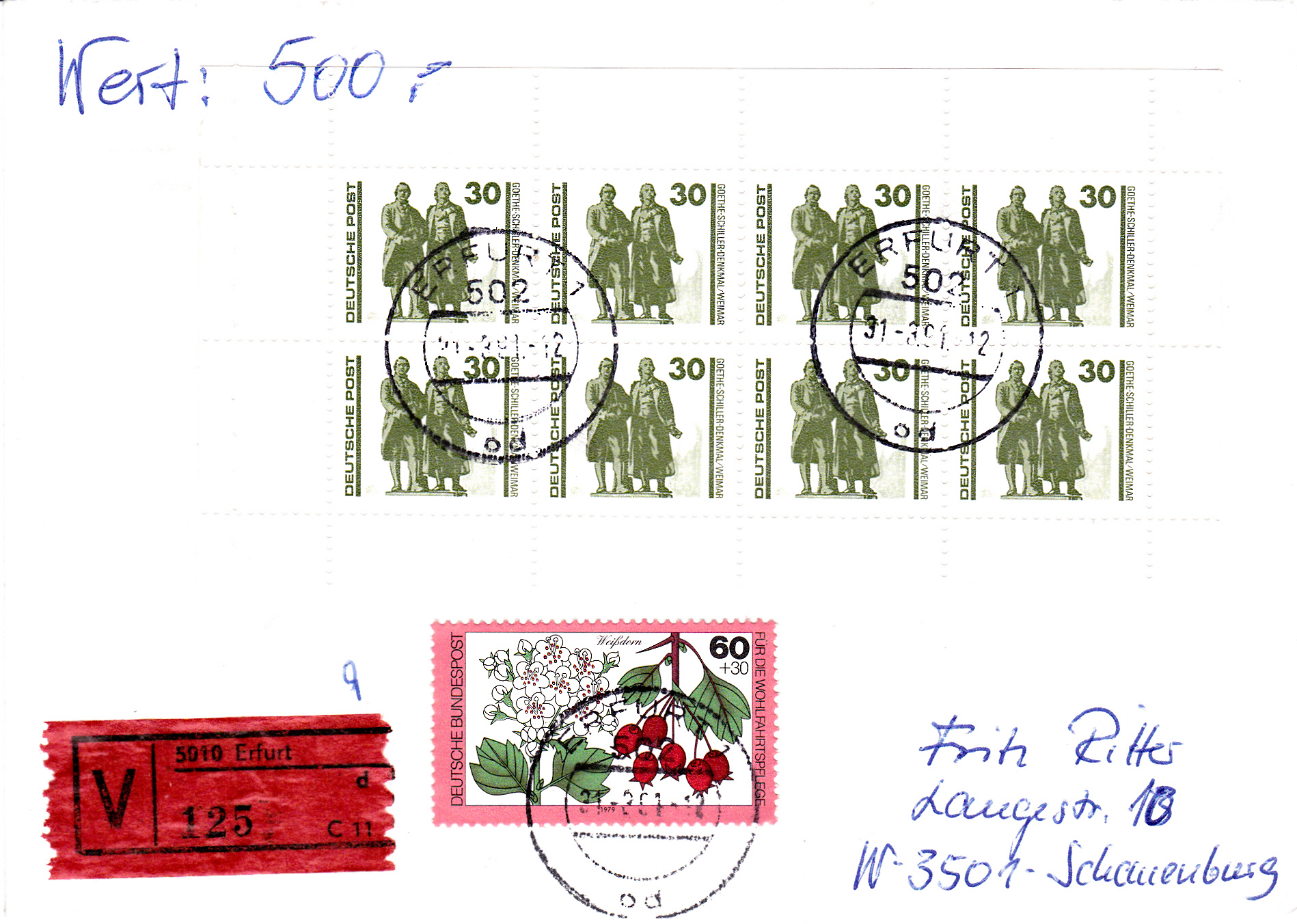 Markenheftchenblatt MiNr 20 und eine 60Pf+30Pf-Wohlfahrtsmarke aus dem Jahr 1979 der Deutschen Bundespost auf einem Wertbrief von Erfurt nach Schauenburg. Das Porto betrug für einen Brief bis 20 Gramm im VGO 50Pf, dazu kommen 200Pf Wertgebühr und 50Pf für je 500DM Wertangabe, zusammen also 300Pf.