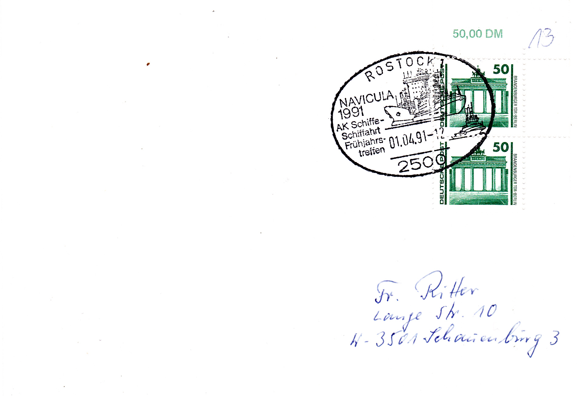 Senkrechtes Paar vom rechten oberen Eckrand der Marke zu 50 Pf der Dauerserie "Bauwerke und Baudenkmäler" (MiNr 3346) auf einem Brief vom 1.4.1991 von Rostock nach Schauenburg. Dieser Brief dokumentiert den ersten Tag des "Normaltarifs" für einen Brief bis 20 Gramm. Am 31.3.1991 ist der Sondertarif im VGO abgelaufen.