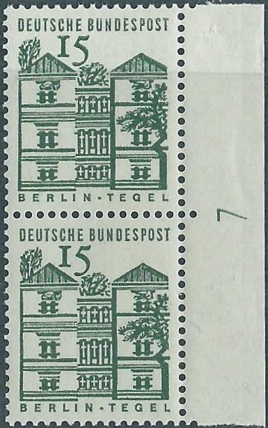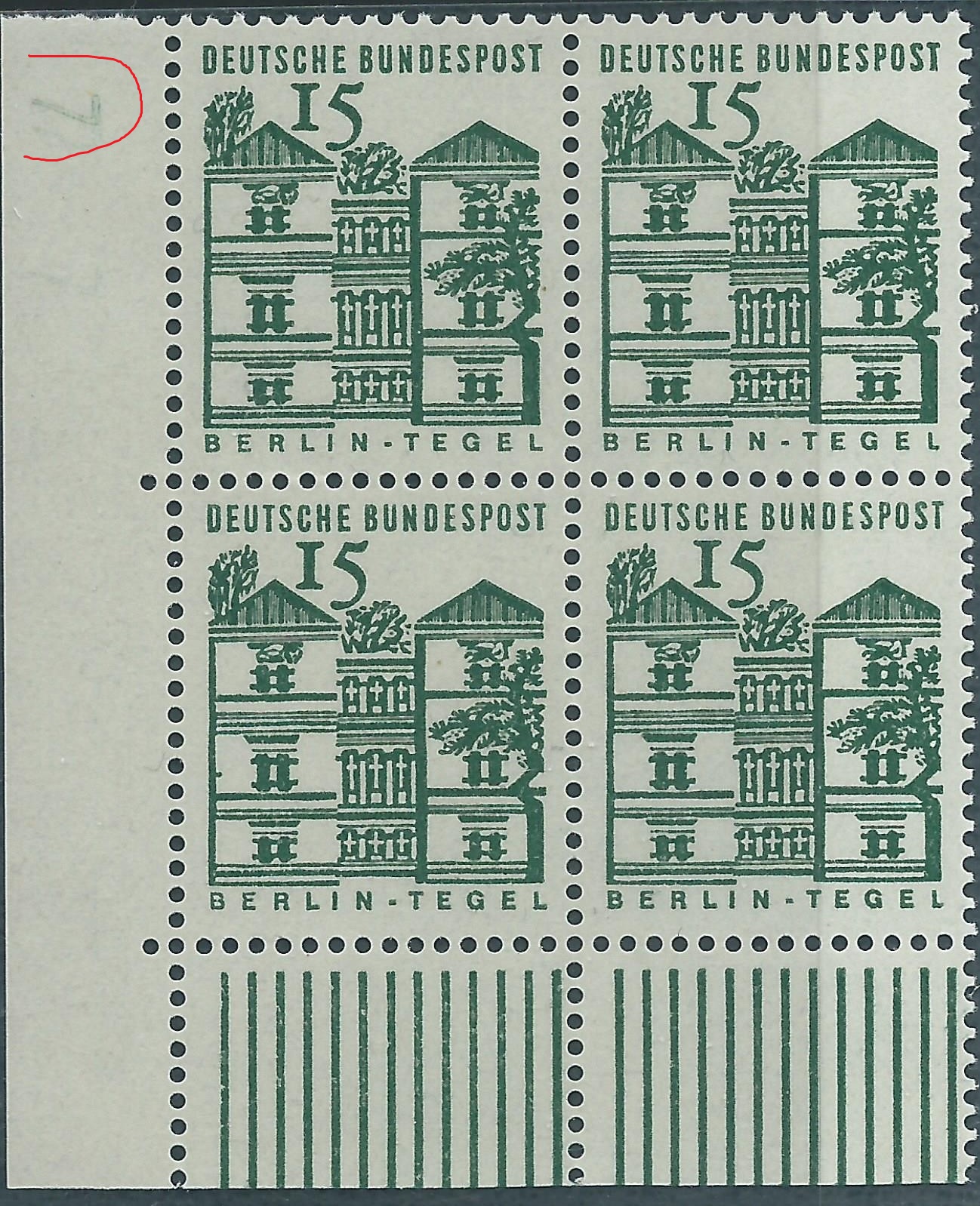 Bei der 15-Pf-Marke ist es richtig gut zu sehen, dass das nicht angehen kann. Hier haben wir einen Eckrand-4-er-Block aus der rechten unteren Ecke mit Abklatsch. Die Druckerzeichen stehen ab dieser Serie immer nur noch im oberen Bogenbereich in der Nähe der oberen 3 waagerechten Zahnreihen links oder rechts im Rand.