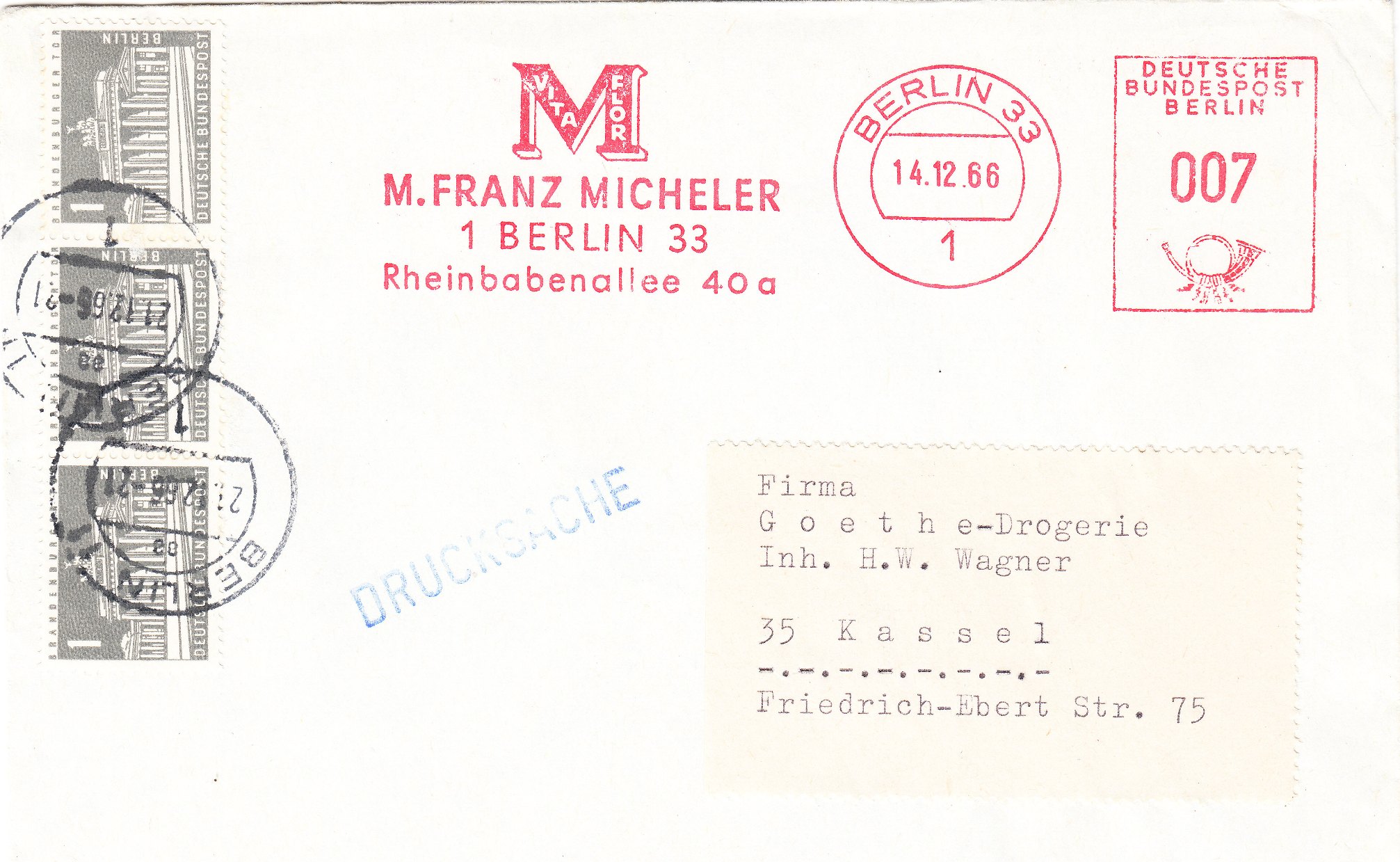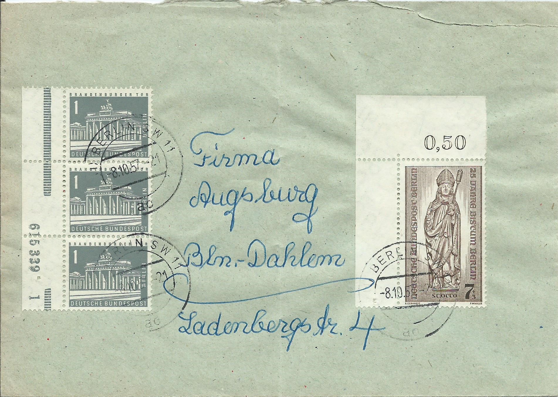 Die am 23.02.1957 erschienene Berlin MiNr. 140 wurde ab dem 20.07.1960 auch an den Postschaltern der Bundesrepublik Deutschland verkauft. Die Idee dabei war, daß diese Wertstufe zu 1 Pfennig aus Solidarität zu Berlin zusätzlich zur eigentlichen Frankatur der Sendung verklebt werden sollte.