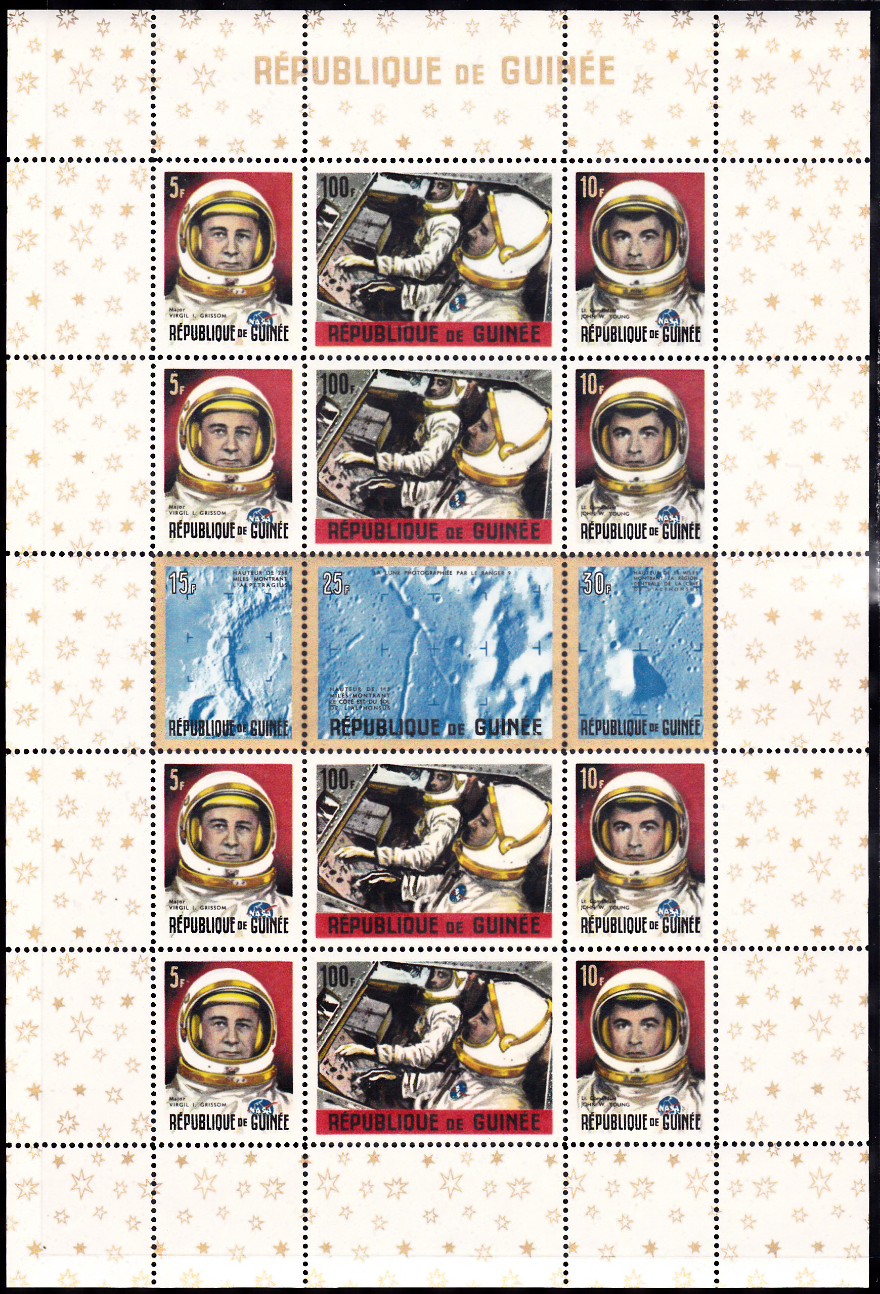 Auf dieser Marke aus Guinea (MiNr 302) ist ein Portrait des Astronauten Virgil Grissom im Raumanzug zu sehen.