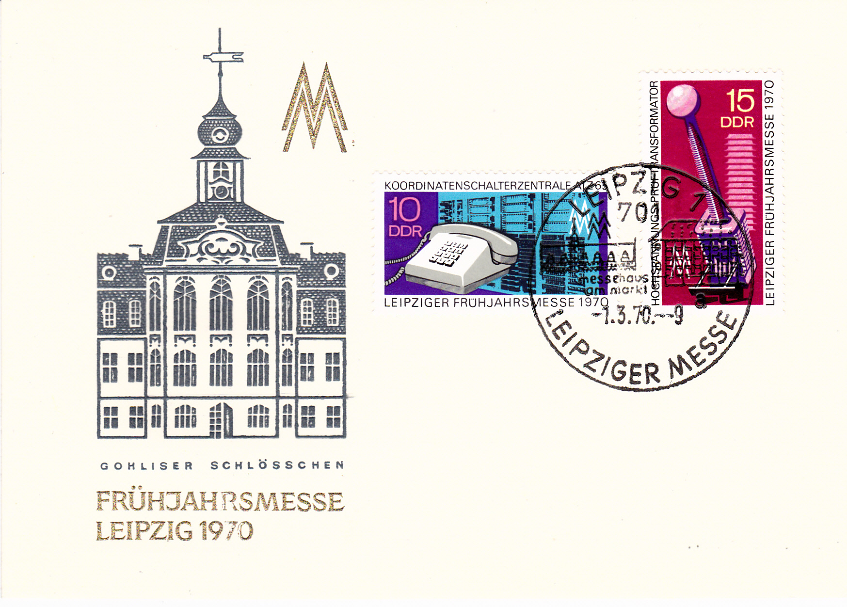 Auf dieser Stempelkarte sind die beiden Marken zur Leipziger Frühjahrsmesse 1970 (MiNr 1551/1552) mit einem Sonderstempel zur Messe mit der Abbildung "Messehaus am Markt" am 1.3.1970, dem Eröffnungstag der Messe, abgestempelt worden.