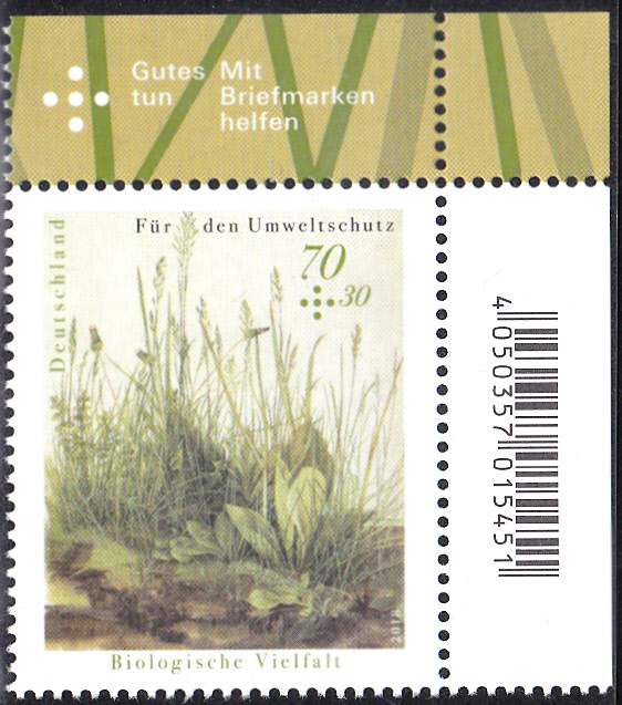 Die Marke der Deutschen Post zum Umweltschutz erschien im Jahre 2018 zum dem Thema "Biologische Vielfalt" und zeigt eine Wildwiese mit verschiedenen Pflanzen und Tieren. Hier eine Marle vom Eckrand mit EAN-Code:
