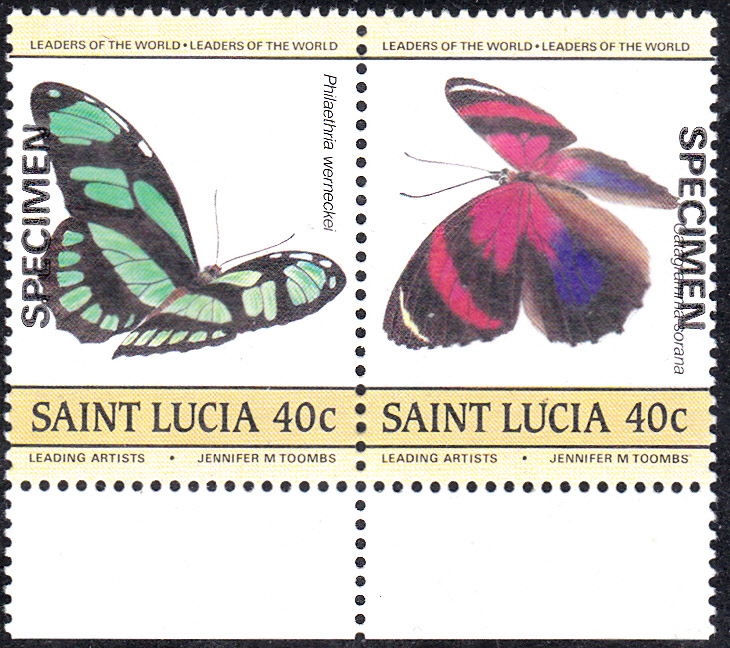 In St.Lucia ist in einer Serie auch eine Marke (MiNr 734) mit einem Philaethria wernecki erschienen. Hier zeige ich eine Mustermarke dieser Ausgabe: