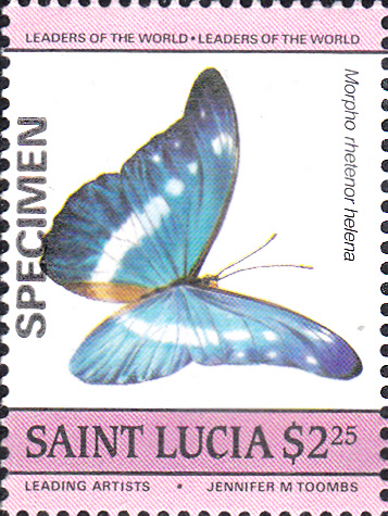In St.Lucia ist in einer Serie auch eine Marke (MiNr 738) mit einem Falter der Unterart Morpho rhetenor helena erschienen. Hier zeige ich eine Mustermarke dieser Ausgabe: