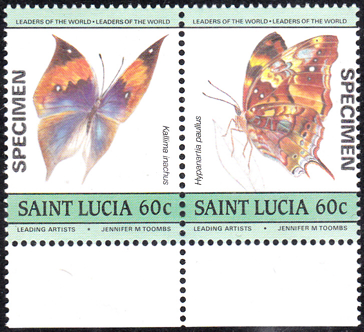 In St.Lucia ist in einer Serie auch eine Marke (MiNr 736) mit einem Kallima inachus erschienen. Hier zeige ich eine Mustermarke dieser Ausgabe: