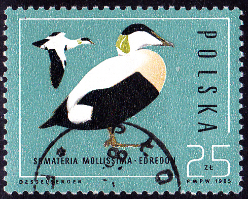 Auf dieser Marke aus St. Pierre und Miquelon (MiNr 398) sehen wir ein Männchen der Eiderente (Somateria mollissima) und fliegend vermutlich ein Weibchen.