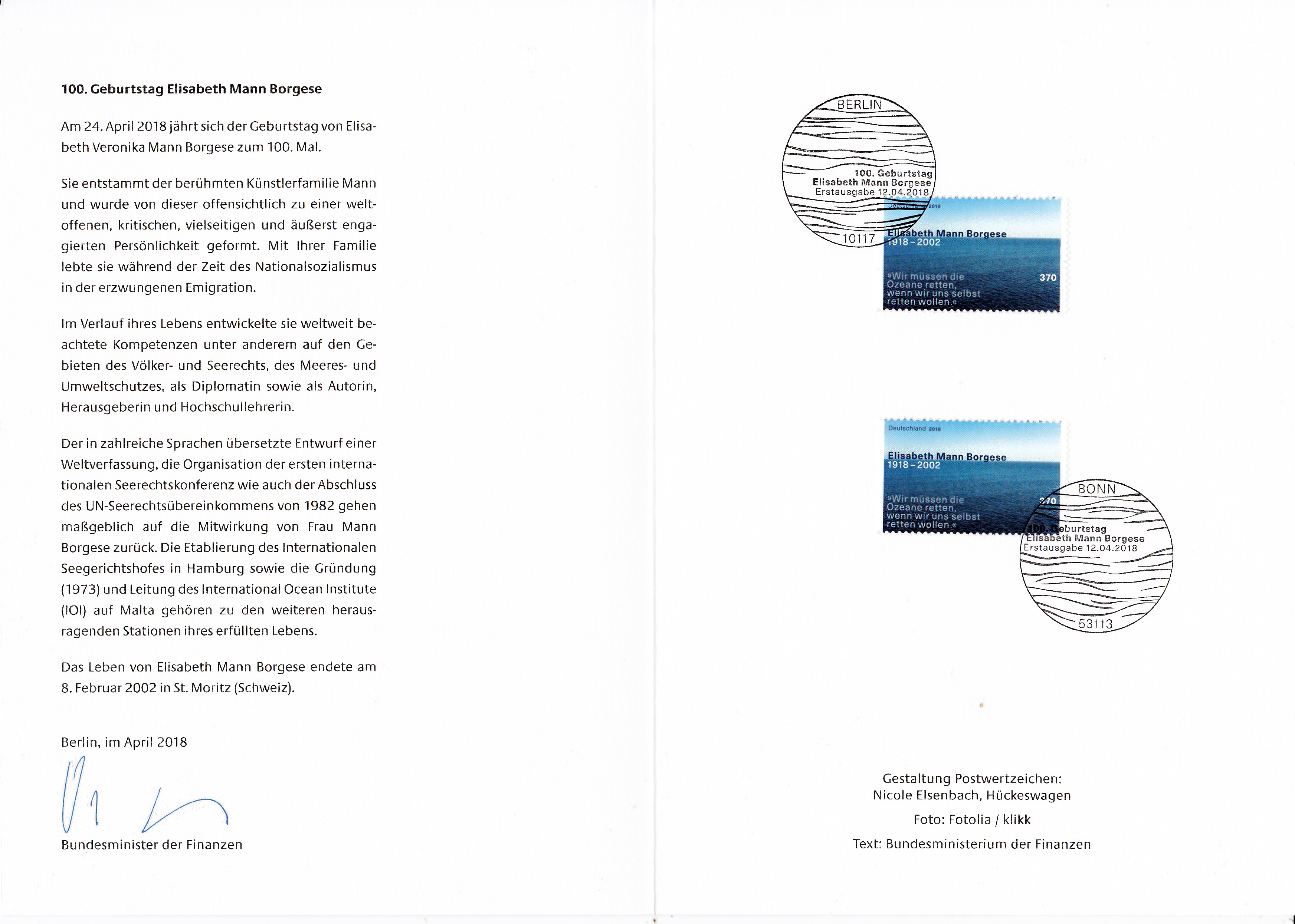 Klappkarte des Vorstandsvorsitzenden der Deutschen Post AG mit der Marke "100. Geburtstag von Elisabeth Mann Borgese" und dem Ersttagsonderstempel aus Bonn.