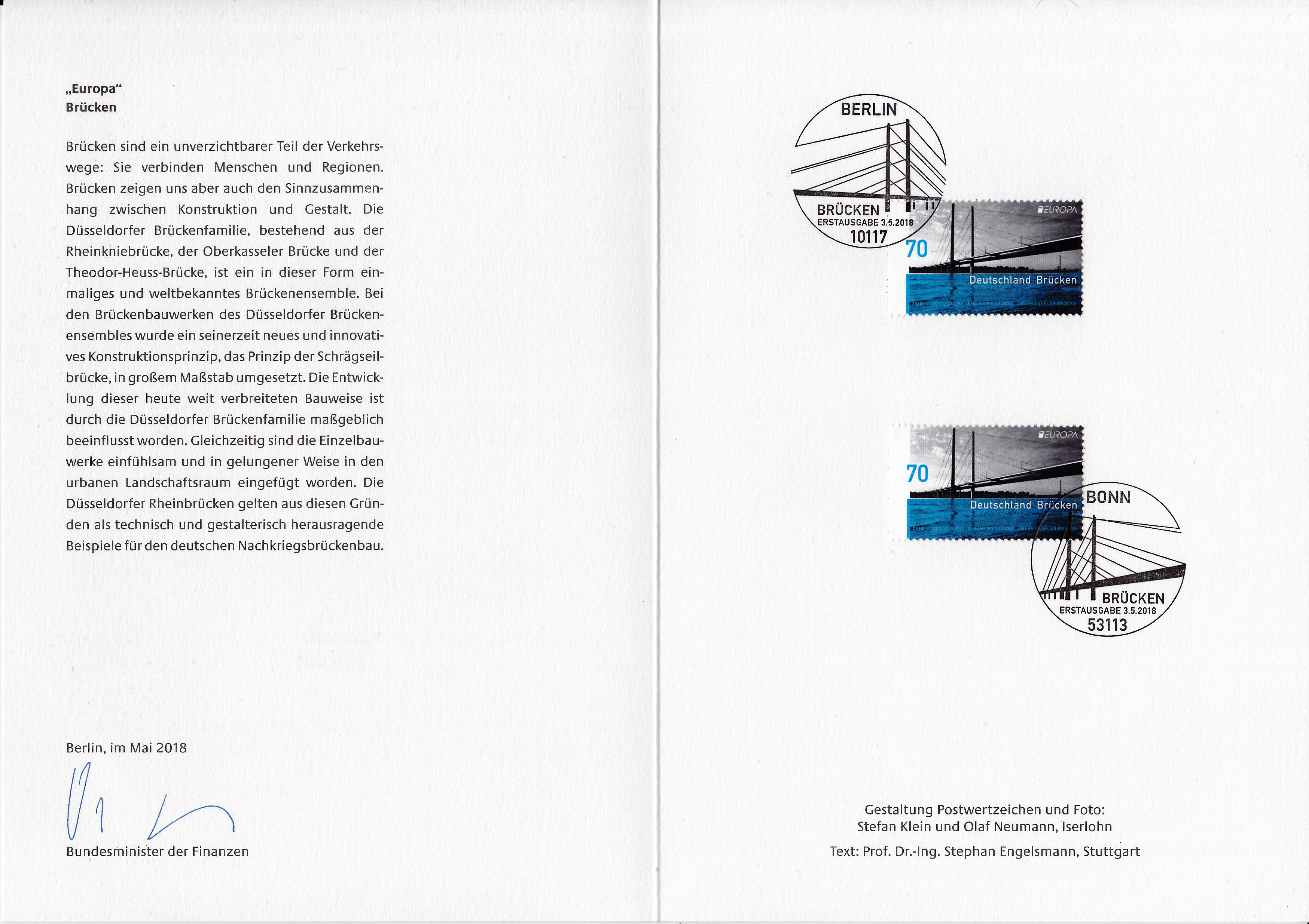 Ministerkarte mit zwei Marken Europa2018 mit dem Gemeinschaftsthema "Brücken" eine mit dem Stempel Berlin und die zweite mit dem Stempel Bonn gestempelt.