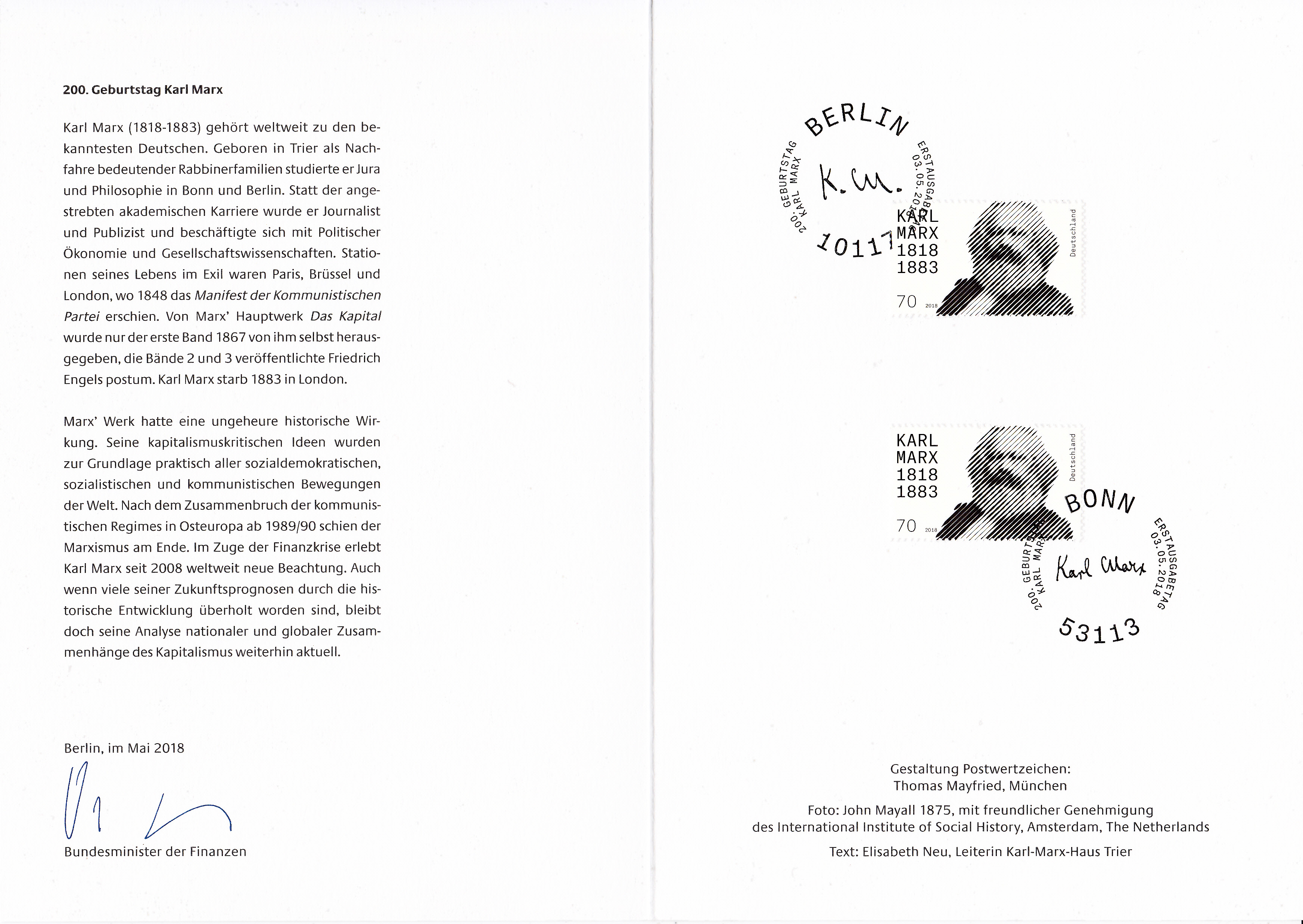 Diese Ministerkarte mit zwei Marken zum 200. Geburtstag von Karl Marx eine mit dem Stempel Berlin und die zweite mit dem Stempel Bonn gestempelt wurde bei der Offiziellen Markenübergabe verteilt und unterscheidet sich von der normalen "weißen" Ministerkarte. Der Umschlag der Ministerkarte zeugt einen Ausschnitt aus dem Markenbild.