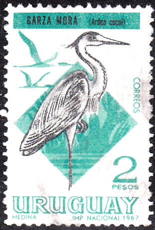 Eine Marke aus Uruguay (MiNr 1110) zeugt uns einen Cocoireiher (Ardea cocoi).