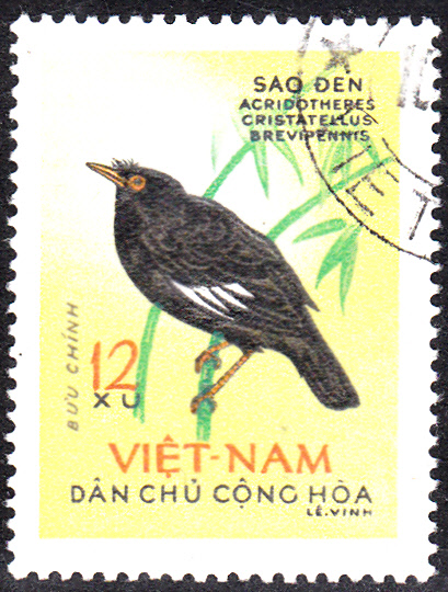 Auf dieser Marke aus Vietnam (MiNr 276) ist eine Haubenmaina (Acridotheres cristatellus) der Unterart Acridotheres cristatellus brevipennis zu sehen. Diese kommt in Laos, Vietnam (außer im Süden),and Hainan (Süd-China) vor. Im Michel wird sie mit Hainan-Haubenmaina (Acridotheres cristatellus brevipennis) beschrieben.