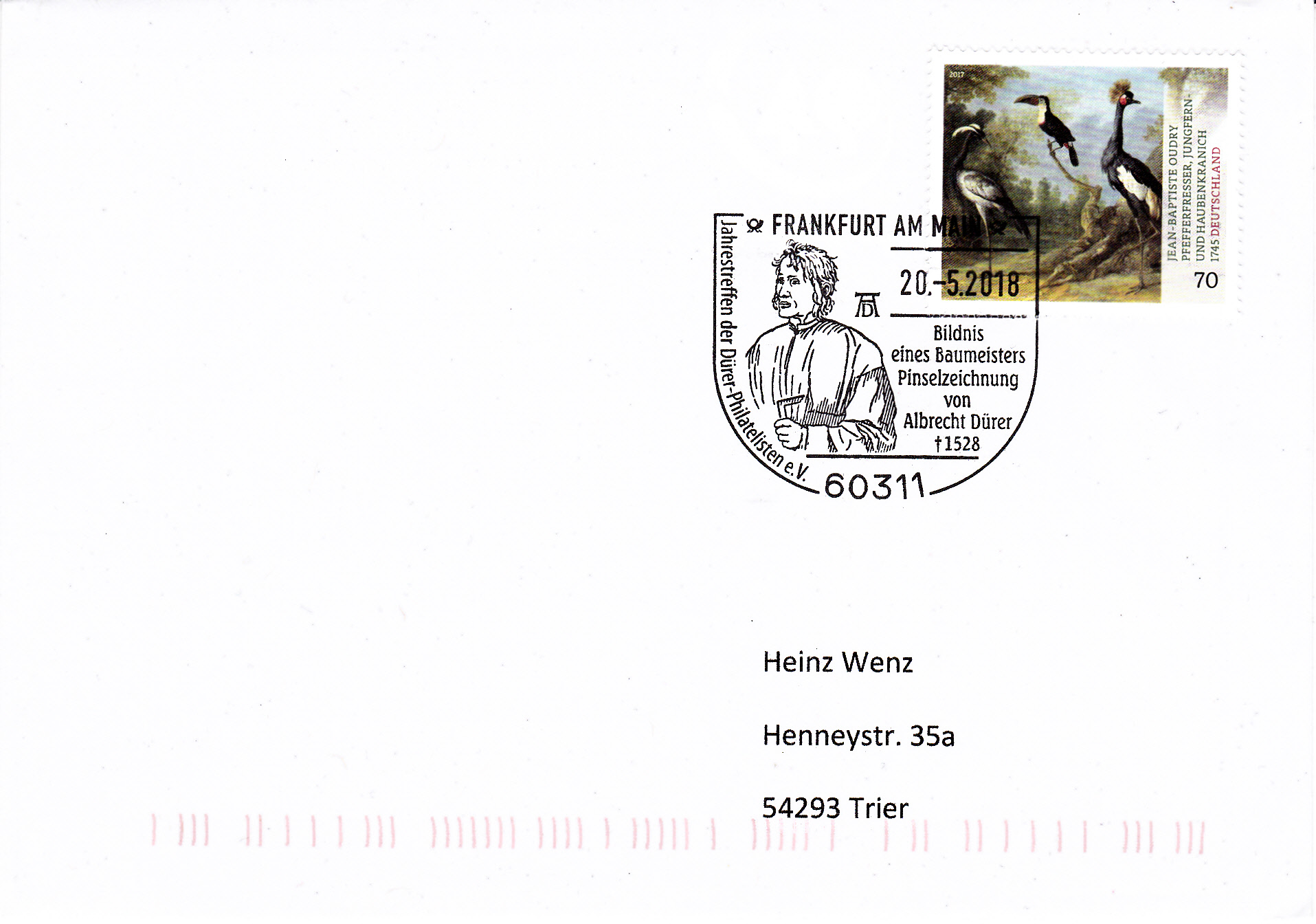 Zum 500. Geburtstag von Albrecht Dürer erschien bei der Deutschen Bundespost eine Marke (MiNr 677) mit Signum "AD"von A. Dürer. Hier eine Marke auf einem gelaufenen Ersttagsbrief mit dem Ersttagsonderstempel Bonn.