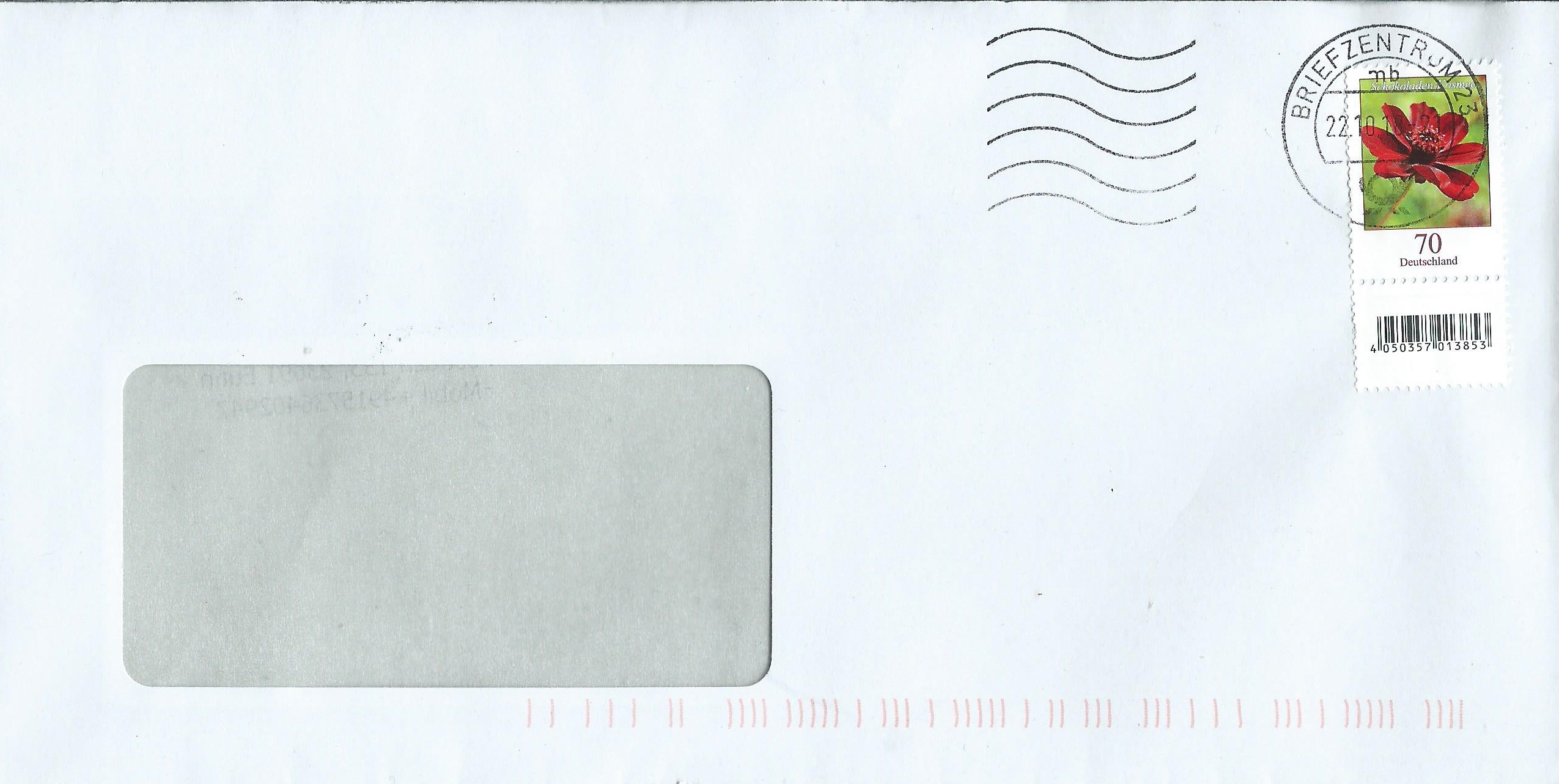 Einmal der Wert zu 70 ct mit der Nummer 4050357013853, rückseitig schimmert die Zählnummer 165 durch. Gestempelt wurde am 22.10.18 im Briefzentrum 23.