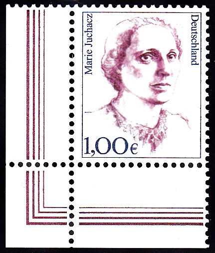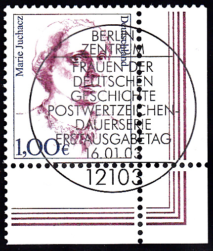 Am 16.01.2003 erschienen bei der Deutschen Post ein Ergänzungswert in der Dauerserie "Frauen der deutschen Geschichte" zu 1,00€ (MiNr 2305) mit einem Porträt von Marie Juchacz (1879-1956, Sozialpolitikerin und Frauenrechtlerin). Hier ein Eckrandstück dieser Marke: