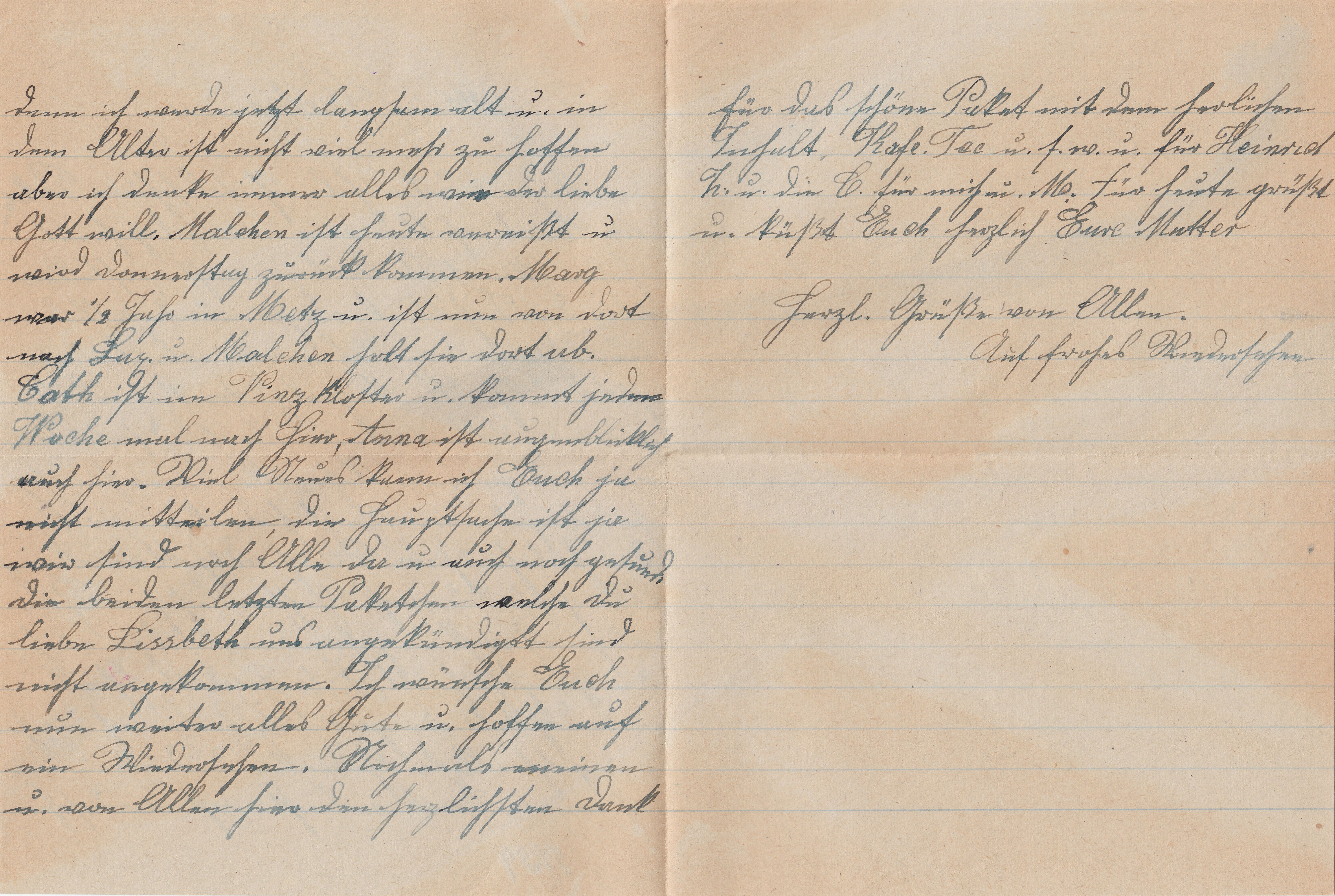 Diese Postkarte durchlief in der ABP München die chemische Zensur mit zwei verschiedenen Chemikalien. Eine Chemikalie wurde auf der Vorderseite diagonal von links oben nach rechts unten angewendet und blaue Tinte wurde auf der Rückseite diagonal von links unten nach rechts oben angewendet.