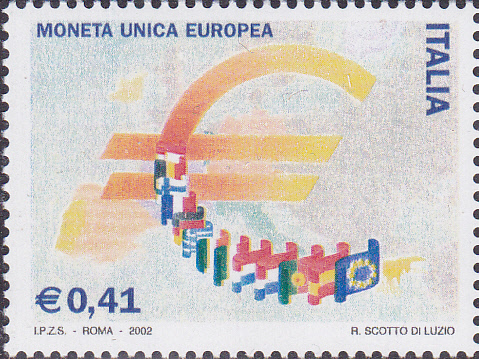 In der gleichen Ausgabe aus Italien ist auch diese Marke (MiNr 2802) mit einem Euro-Zeichen mit Flaggen der Euro-Länder und einer Landkarte Europas im Hintergrund.