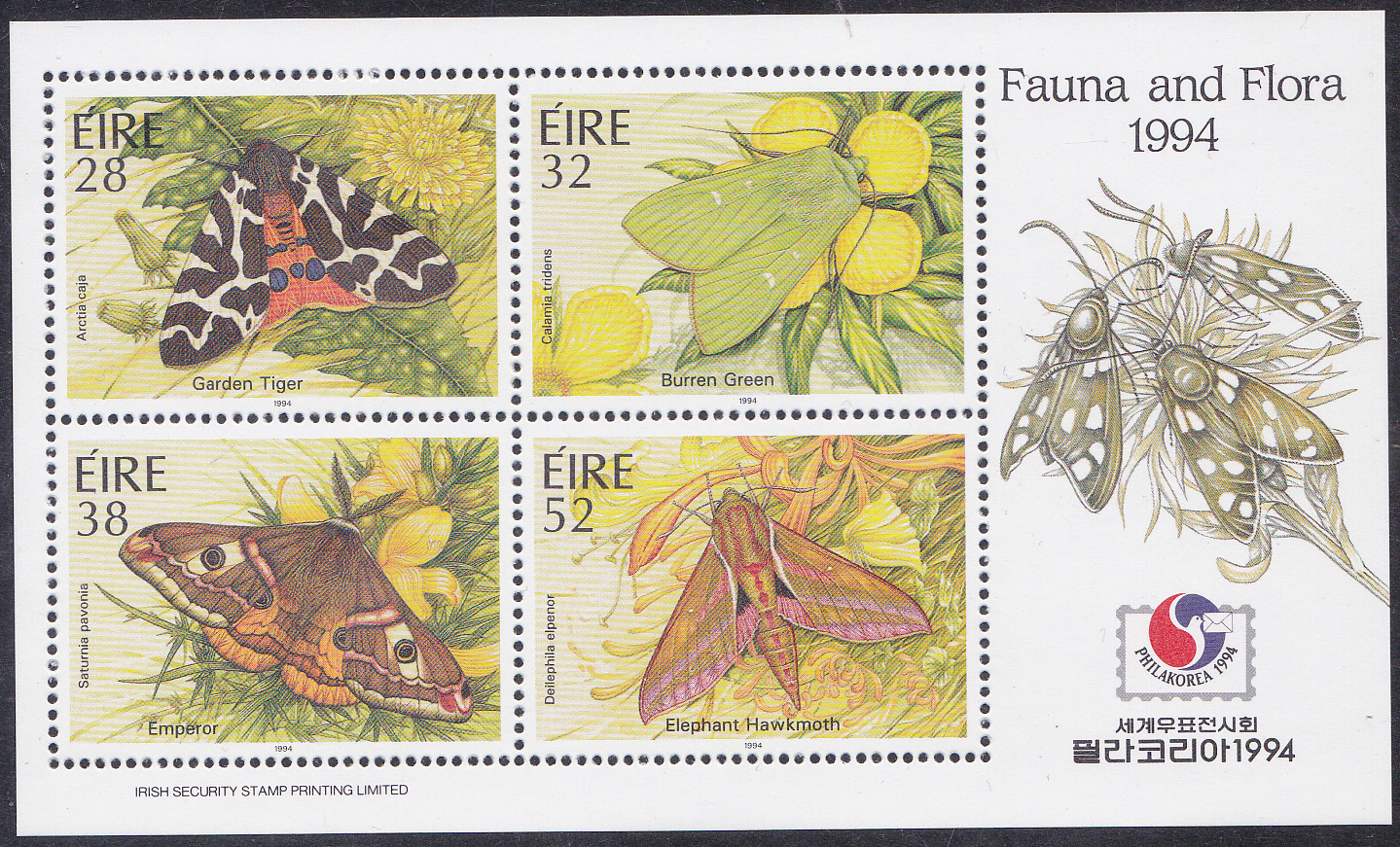 In einer Serie "Nachtfalter" ist in Irland diese Marke (MiNr 863) mit einem Kleinen Nachtpfauenauge (Saturnia pavonia) erschienen.