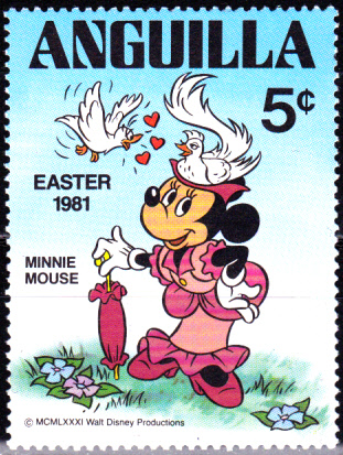 Zu Ostern verausgabte Anguilla diese Marke zu 1 Cent (MiNr 432) mit der Abbildung von Minnie Mouse mit einem Osterstrauß.