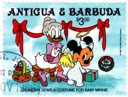 Auf der Marke zu 3,00 $ aus der Weihnachtsserie 1986 von Antigua und Barbuda näht Oma für Minnie Mouse ein Engelskostüm.