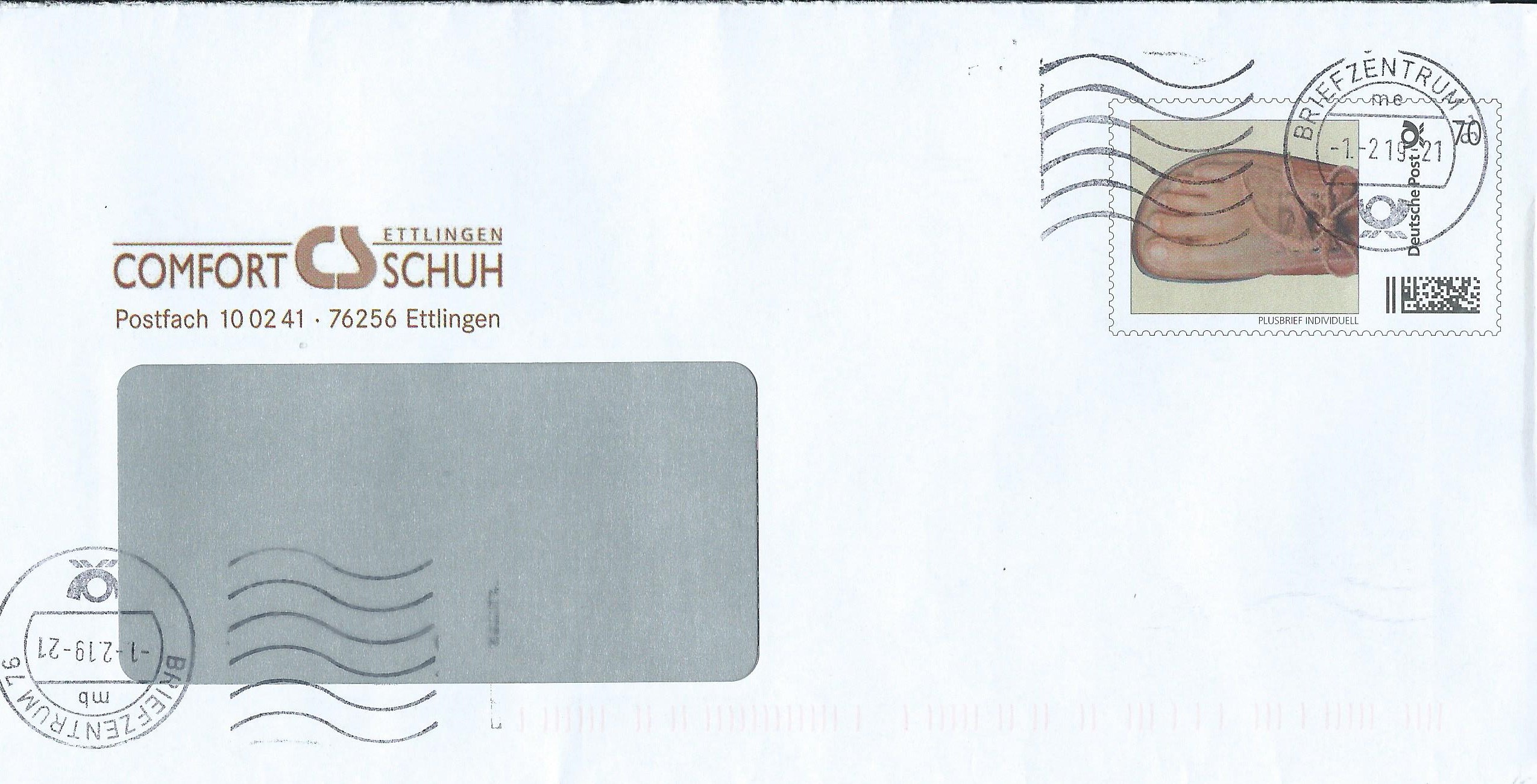Zum einen ein Wertstempel zu 70 Cent, als Motiv ein Schuh. Passt auch zum Absender, es ist die Firma Comfort-Schuh. Gestempelt wurde der Beleg am 1.2.19 im Briefzentrum 76, das komischer weise auch oben über dem Wertstempel (Normalfall) und zusätzlich unten links, da scheint der Brief wohl kopfstehend in die Maschine gelangt zu sein.