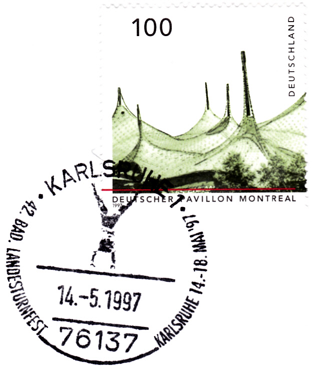 Sonderstempel vom 14.5.1997 aus Karlsruhen zum 42. Bad. Landesturnfest vom 14.-18.Mai 1997 in Karlsruhe. Im Stempelbild wird ein Bodenturner gezeigt.
