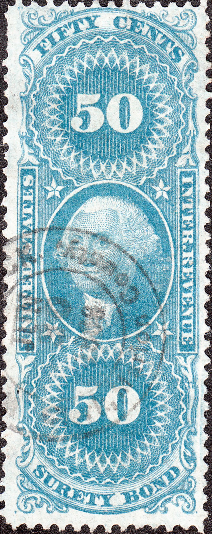 Die Wertstufe zu 50 Cents in blau mit der Inschrift "SURETY BOND" katalogisiert Scott als Hauptnummer "R63", die gezähnte Version als "c":