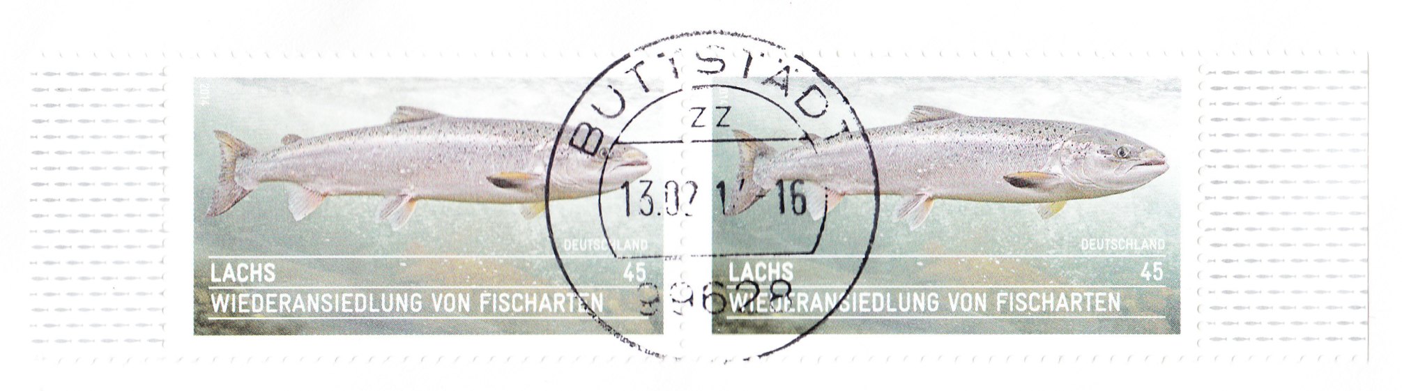 Am 02.01.2014 erschien eine Sondermarke zum Thema "Lachs - Wiederansiedlung von Fischarten", hier als Paar mit anhängenden Bogenrändern des Zehnerbogens: