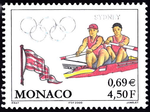 Auf einer Marke aus Monaco (MiNr 2507) zu den Olympischen Spielen 2000 ist ein Zweier ohne Steuermann der Männer abgebildet.