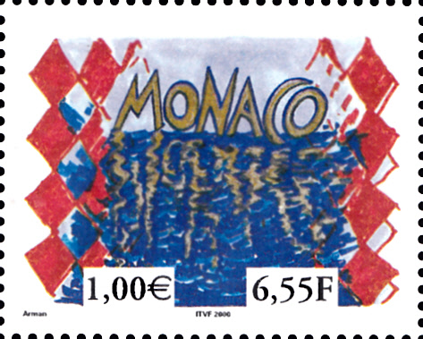 In einer Serie "Gemälde im Fürstentum tätiger Künstler zum Thema 'Monaco und das Meer'" erschien diese Marke aus Monaco (MiNr 2491) mit einem Werk von Arman.