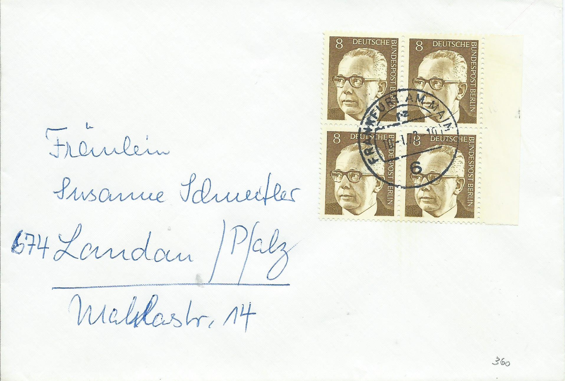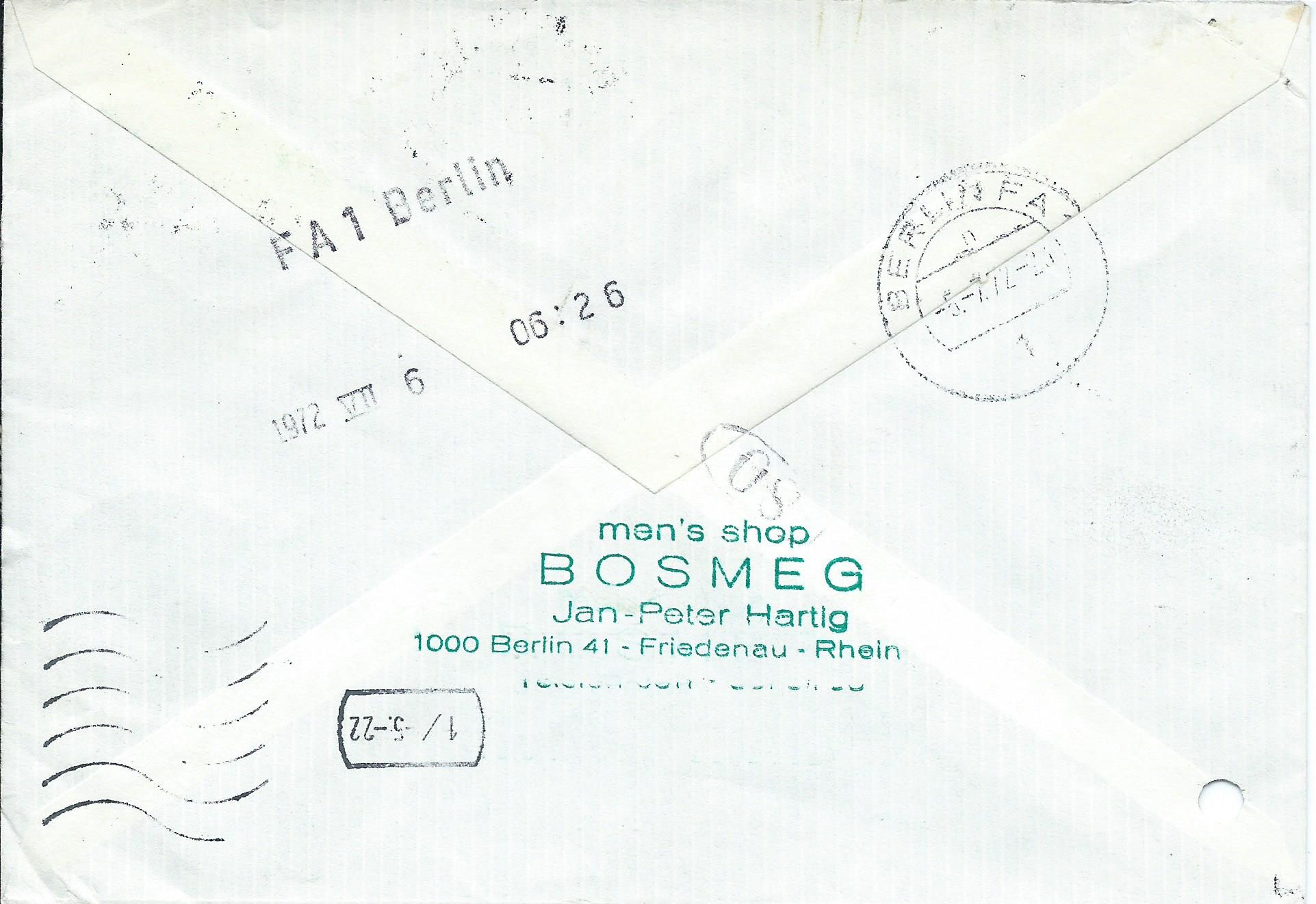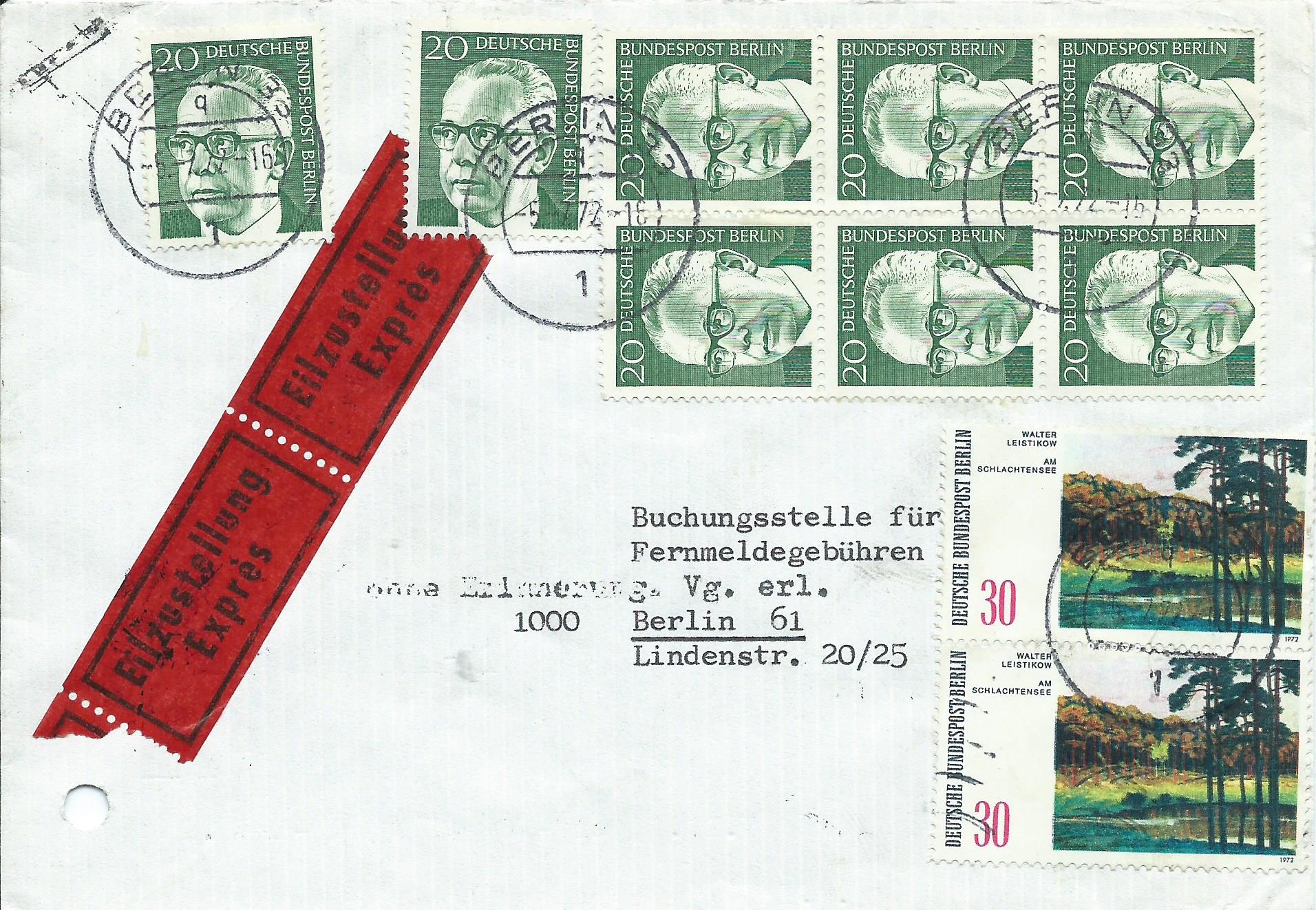 Ein Bedarfs-Eilbrief mit 8 Werten zu 20 Pf, davon 6 im senkrechten Block, und 2 Sondermarken. Interessant ist hier auch die Rückseite des Briefes mit den ganzen Durchgangsstempeln. Abgeschickt wurde er am 5.7.72 um 16 Uhr und am 6.7. scheinbar gegen 7 Uhr zugestellt.