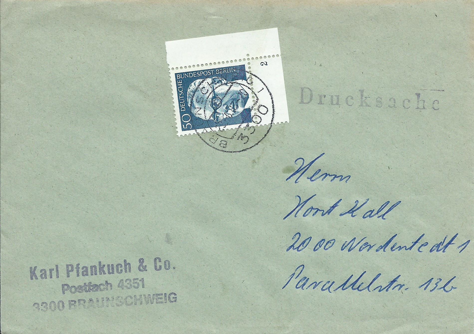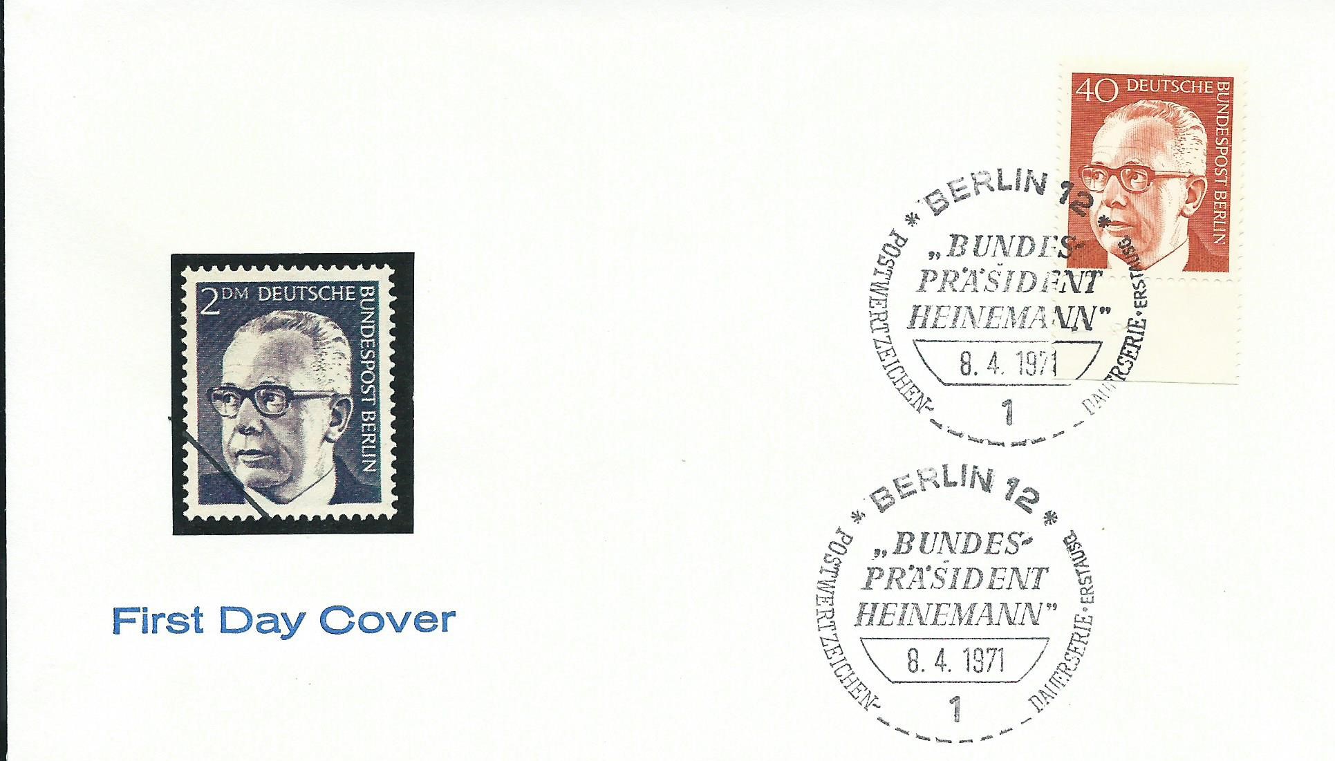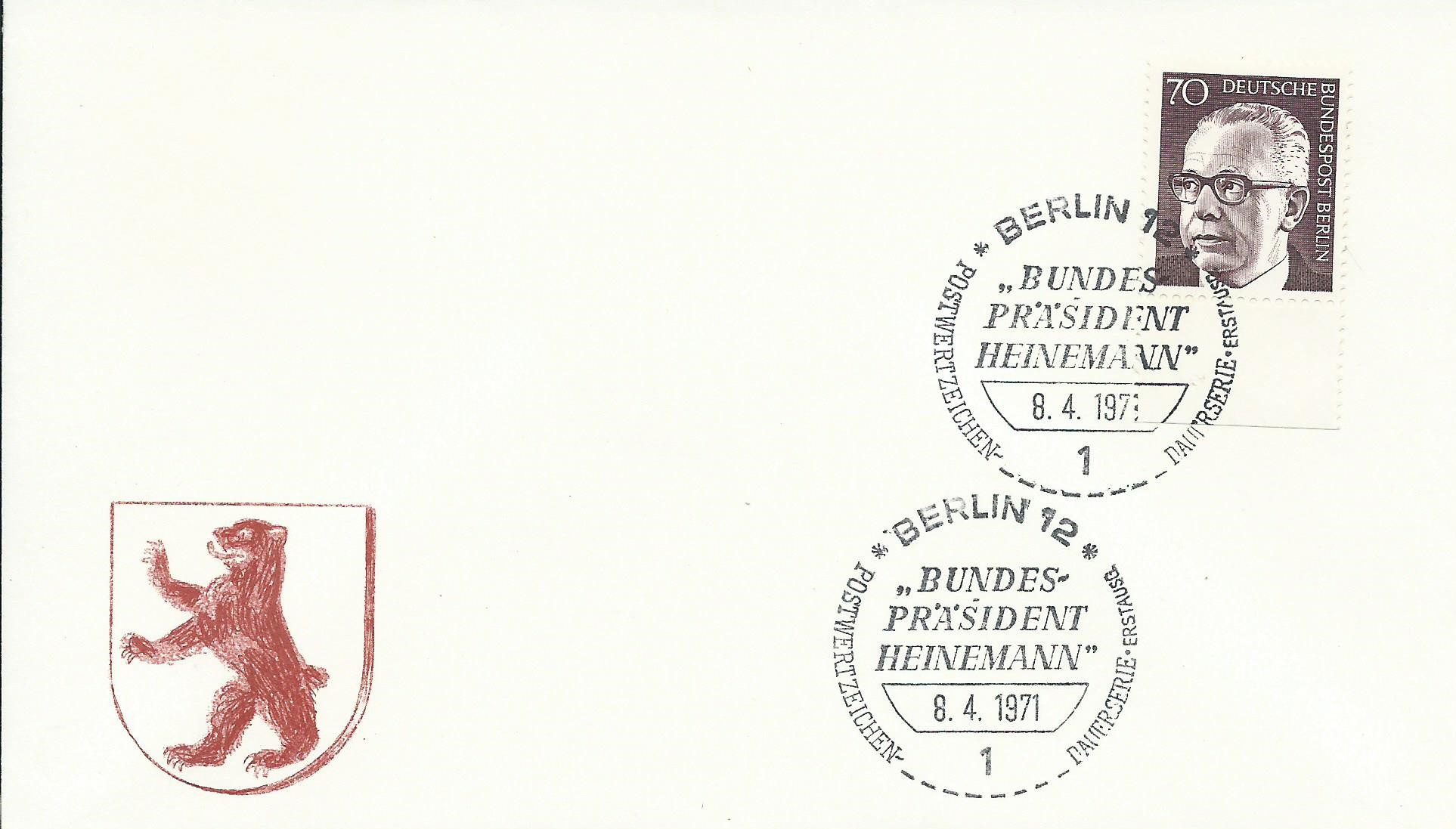 Und als letzter für heute ein Ersttagsbrief mit allen an dem Tag erschienenen Marken zu 8, 40, 50, 70 und 80 Pf jeweils vom Unterrand. Gestempelt wurde mit dem passendem Berlin-Ersttagssonderstempel am 8.4.71: