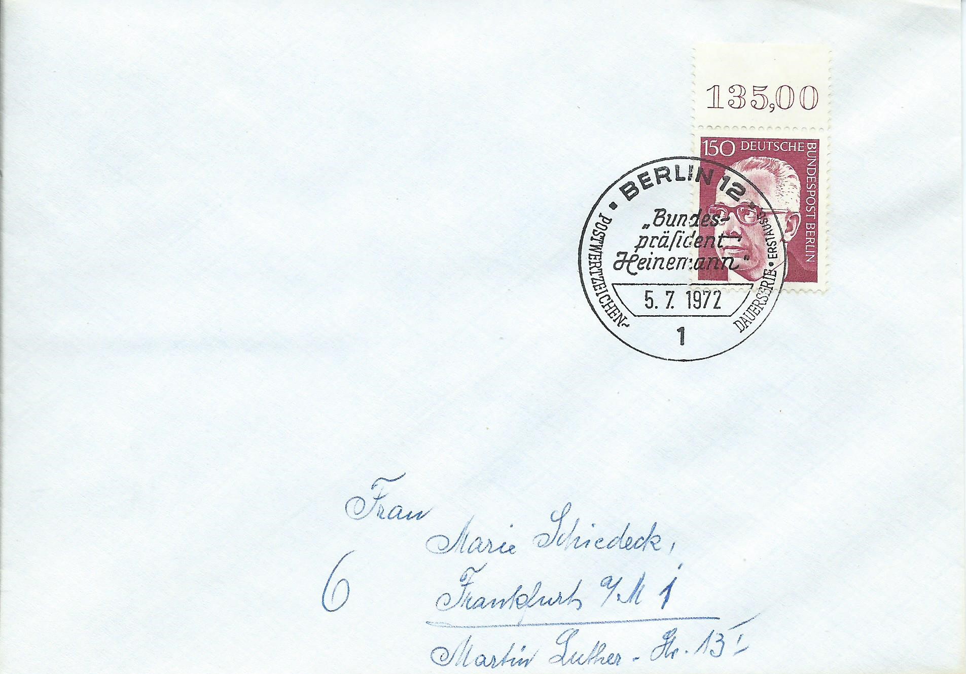 Dann eine Einzelmarke zu 150 Pf vom Oberrand mit Reihenwertzähler 135,00 als Ersttagsbrief gestempelt mit dem Ersttagssonderstempel Berlin vom 5.7.72:
