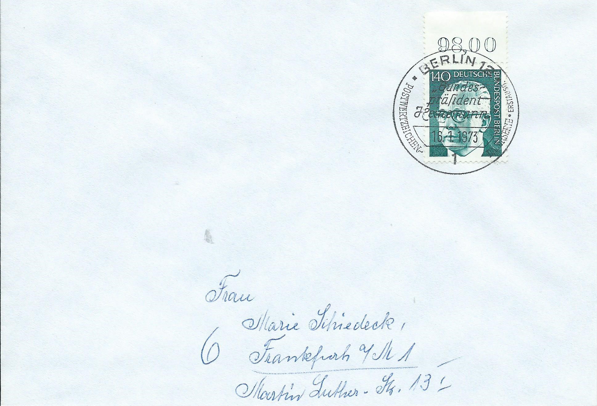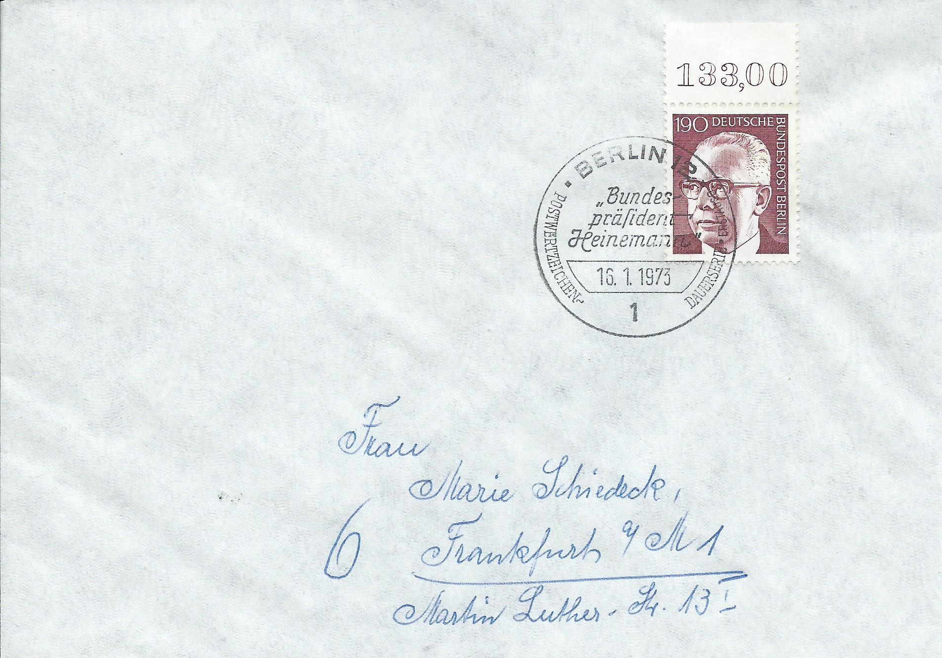 Und eine Einzelmarke zu 190 Pf vom Oberrand mit Reihenwertzähler 133,00 als Ersttagsbrief gestempelt mit dem Ersttagssonderstempel Berlin vom 16.1.73: