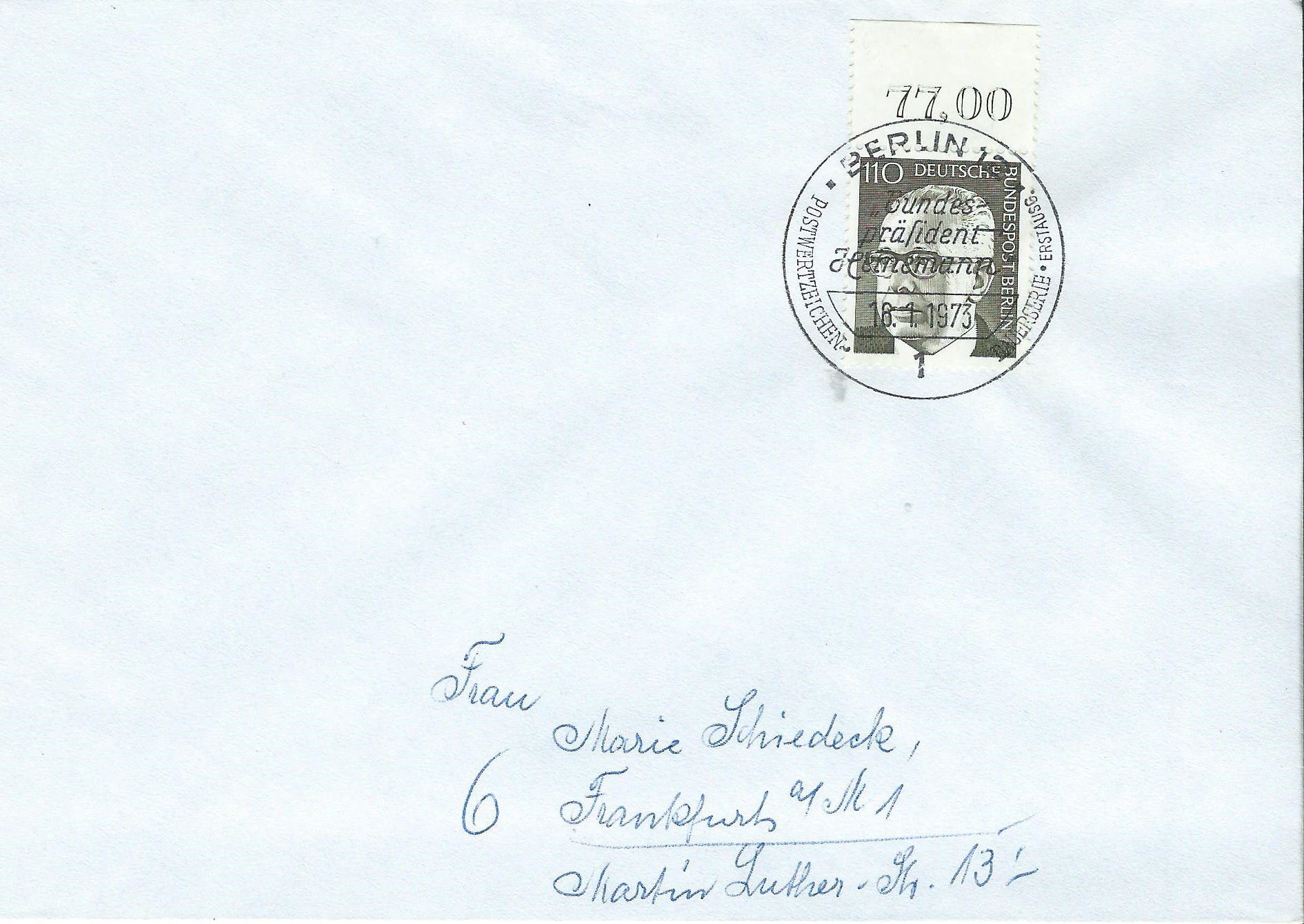 Der Wert zu 110 Pf vom Oberrand mit Reihenwertzähler 77,00 als Ersttagsbrief am 16.1.73 mit dem Berlin-Ersttagssonderstempel gestempelt: