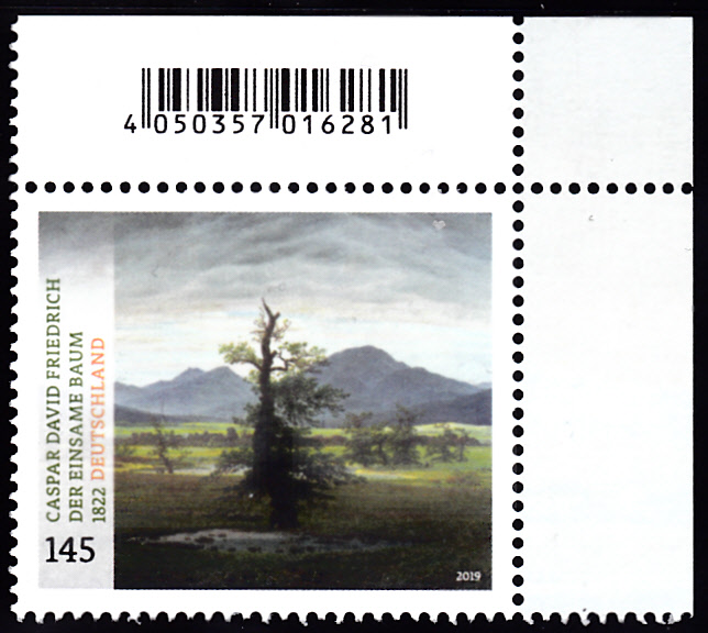 Aus der Reihe "Schätze aus deutschen Museen" stammt diese Marke der Deutschen Post mit dem Gemälde "Der einsame Baum" von Caspar David Friedrich. Die Marke stammt vom Eckrand mit EAN-Codierung.