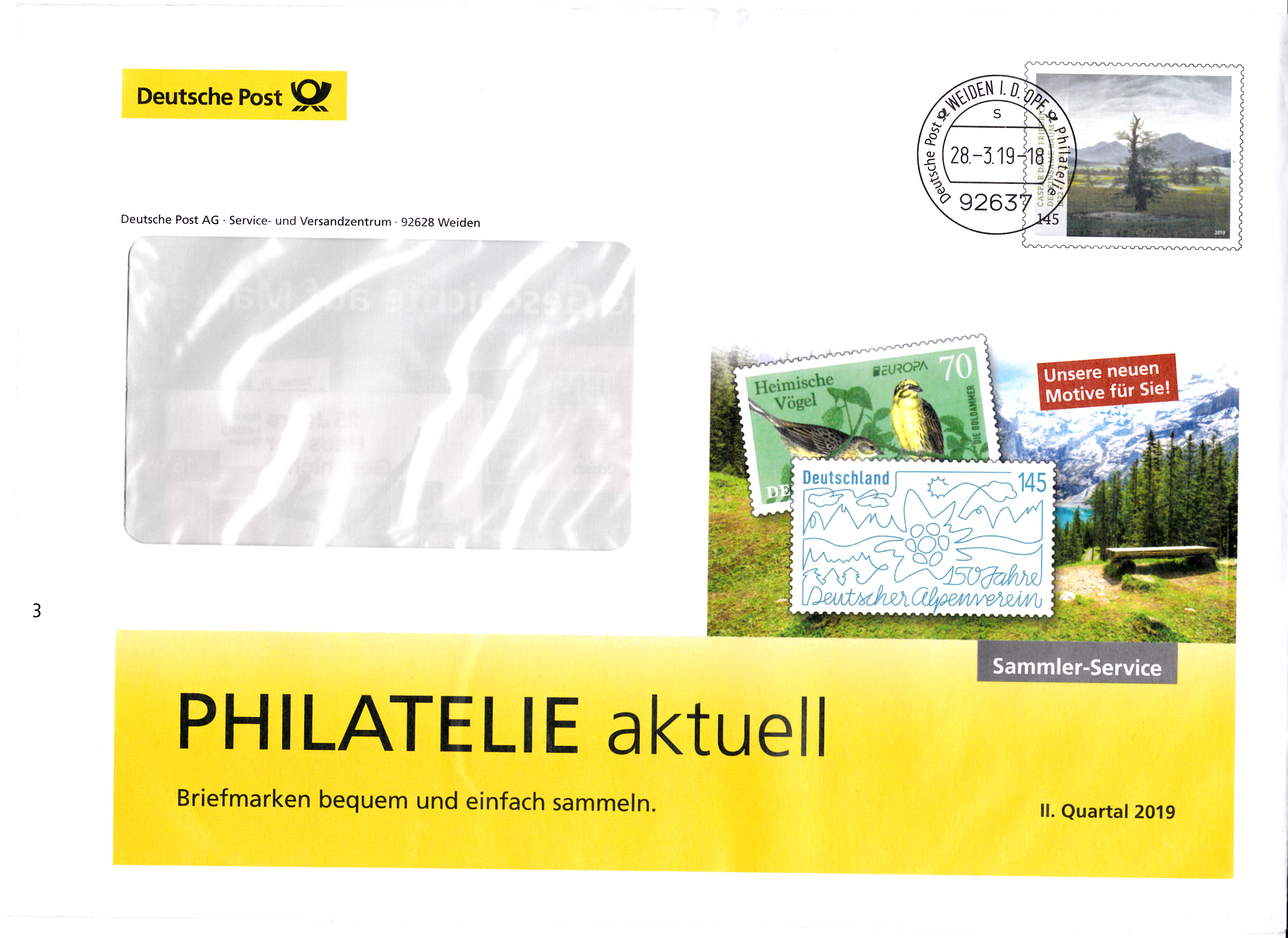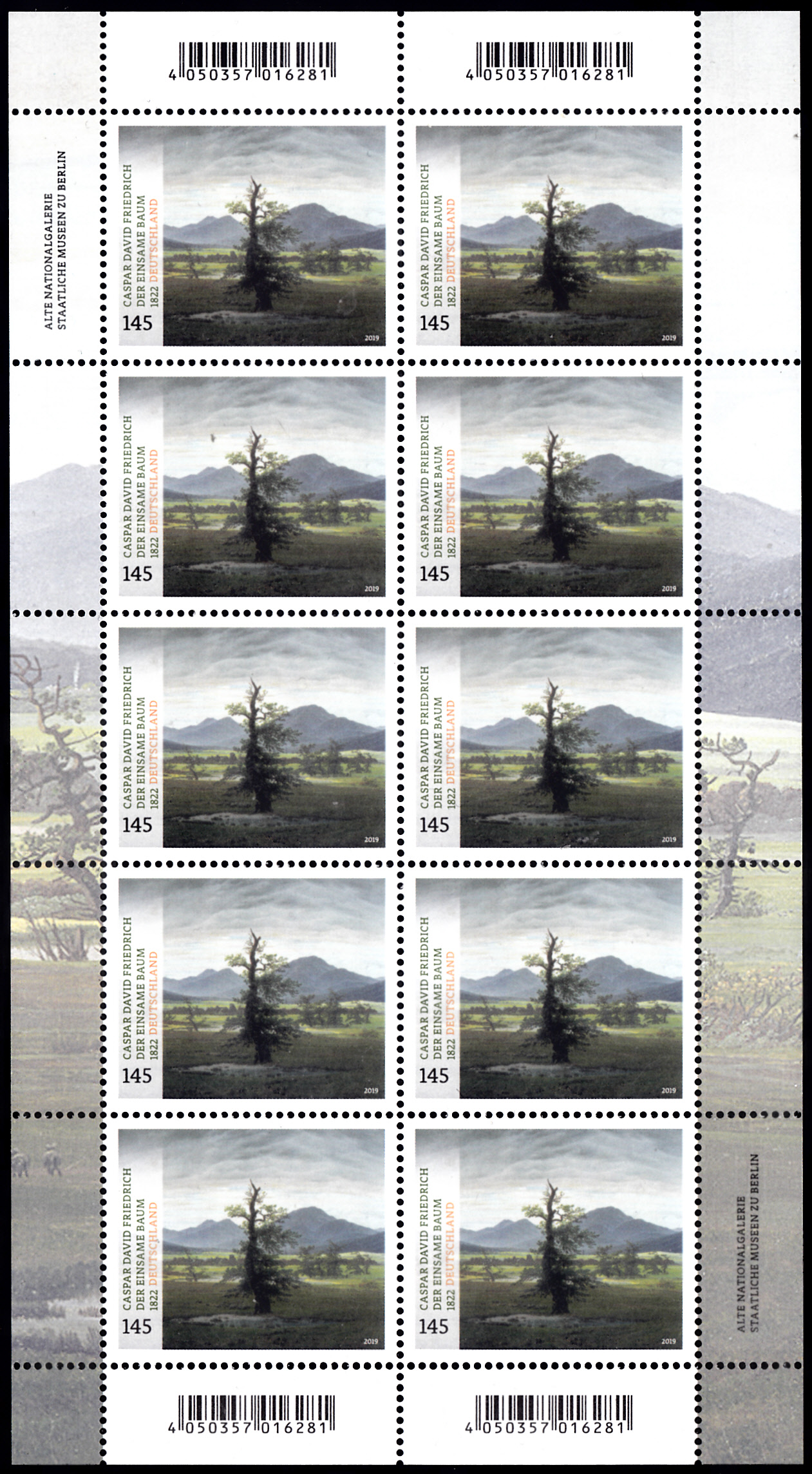 Diese Broschüre im Format 235 x 152 mm (unten geheftet) hat einen Wertstempel mit der 145 Cent Marke "Der einsame Baum" nach dem Gemälde von Caspar David Friedrich (MiNr 3433) aus der Serie "Schätze aus deutschen Museen". Die Vorausentwertung hat das Datum "21.-2.19".