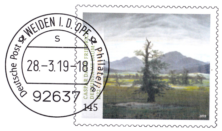 Umschlag im Format 229x162 mm mit einem Wertstempel mit der 145 Cent Marke "Der einsame Baum" nach dem Gemälde von Caspar David Friedrich (MiNr 3433) aus der Serie "Schätze aus deutschen Museen" mit aufgedruckter Zähnung und Vorausentwertung "Deutsche Post (Posthorn) WEIDEN I.D.OPF (Posthorn) Philatelie/ s / 28.-3.19-18".