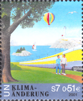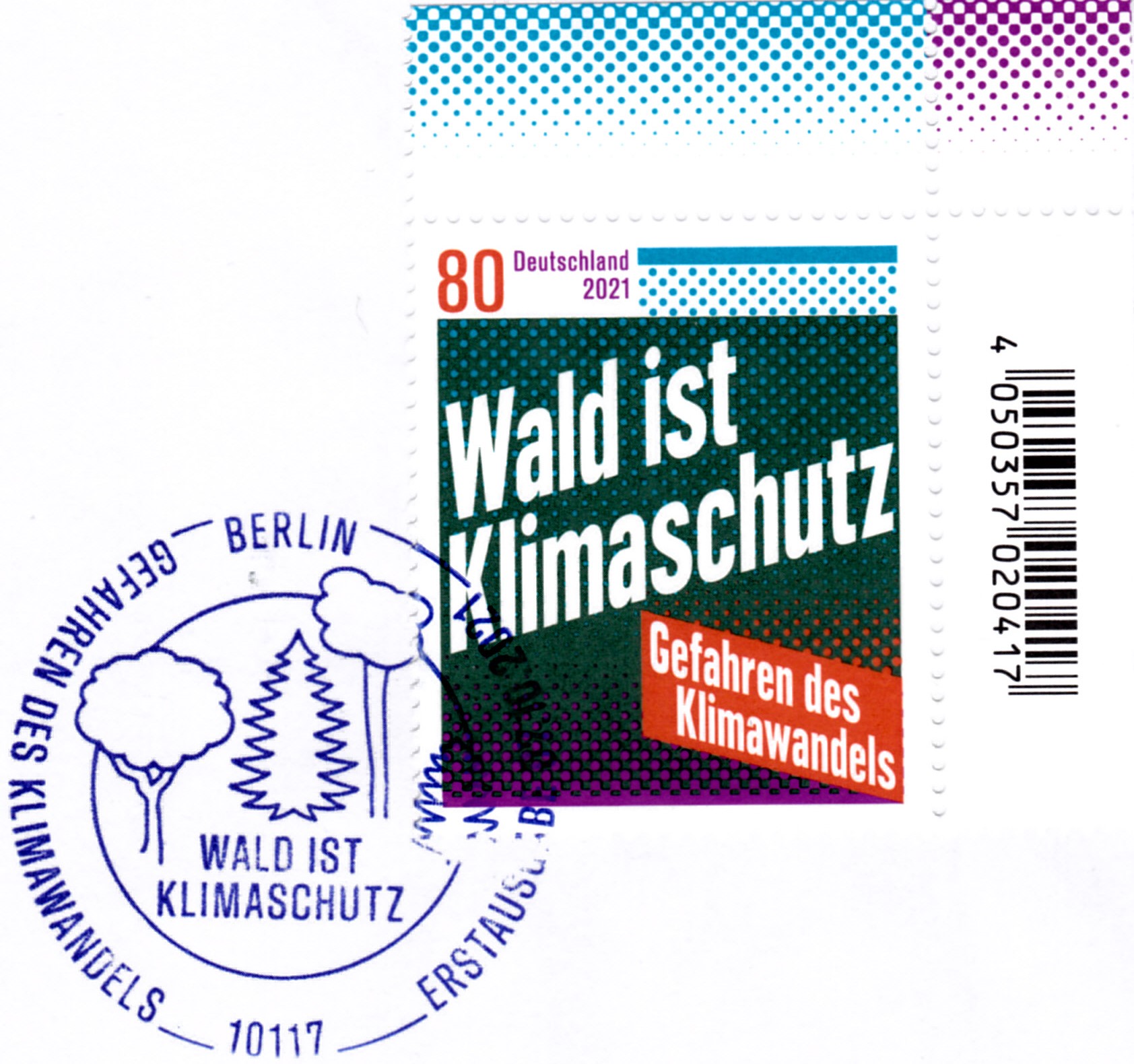 Bei der Deutschen Post ist diese Marke (MiNr 3634) zum Thema "Gefahren des Klimawandels" erschienen. Sie weist mit den Schlagzeilen "Wald ist Klimaschutz" und "Gefahren des Klimawandels" auf die Probleme des Klimawandels hin.