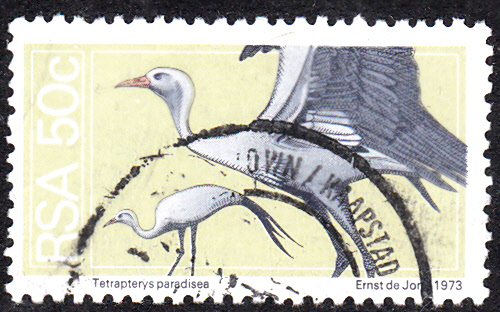 In einer Freimarkenserie ist in Südafrika diese Marke (MiNr 461) mit zwei Paradieskranichen (Anthropoides paradisea) erschienen.
