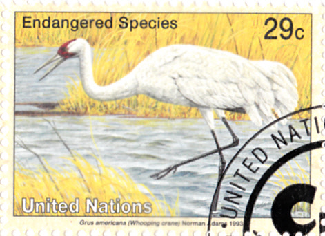 In der Serie "Gefährdete Arten Fauna" erschien bei der Postverwaltung der Vereinte Nationen New York 1993 diese Marke (MiNr 645) mit einem Schreikranich (Grus americana).
