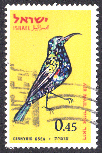 Auf dieser Marke aus Israel (MiNr 1384) wird ein Jerichonektarvogel (Cinnyris osea) vorgestellt. Bei Michel wird er mit Orangebüschel-Nektarvogel (Nectarinia osea) bezeichnet.